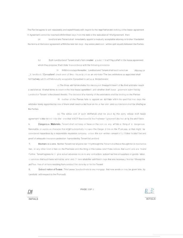 The Pan1es agree to act reasonably and exped1t1ously with regard to the nego11at1on and draltong ol the lease agreement II Agreement cannot bo roached w1th1n hlteen days from the date ot the exec:utoon of 1h1s Agreement. then (a \ landlord ano Tenant shall mmedia r el y appoint a mu t ually acceptable attorney or broker 10 es t ablish l he terms ot the lease agreement w1 1 h1n the next ten days Any assoc,ated cosl:; will be split equally between the Parties. lbJ Both Landlord and Tenant shall o.?ach i mmediatel y subr r 1 1 1n w1111ng. a d1af1 ol the lease agreement which they propose 10 art:i:trate 1n accordance with the following provisions Iii W1th1n hve days t hereafter, Landlord and Tenant shall each select an Attorney or _x landlord (" Co ns ultant' check one \ of thn,r - :ho,ce to ;ir.t as an arb<trator The two arbitrators so appo i nted shall 1m111ed1ately selt:Ct a ll11rd mutudlly acceptable Consultant to acl as a thirdarbnrator. ( 11 ) The three arb 11 ra 1 ors shallw, 1 h,n ten daysot theappo 1 n 1 men 1 of t h e t hird arbitrator reach a oec1s1on as 10 what terms to insert in the ltnal tease agreeMen1 , and whether draft lease ..greement subm11ted by Landlord or Tenant 1s the closest thereto. The decision of a maionly of the arbitrators shall be binding on the Parties 111 It either of the Panies fails to appoint an : irb 111 a t or w 1 th 1 n tho spect 11 od hve days the arbitrator timely appointed by one of them shall reach a dec 1 s,on on his or her own . and sa,d decision shall be b 1 nd 1 ng on t he Parties ( iv) The entue cost of such nrb 1 t 1 a 1 ,on shall be pa,d by tho party whose draft tease agreement 1 s dete rm ined 10 be the one that 1 s NOT the closest lo the l 1 nal lease> 1 greomen 1 dcc 1 ecd on by the arb 111 ators 6 . Dangero u s Mat erials . Tenant shall not keep or have on the rem,sc any ar11clo or thing of a dangerous. flammable, or uxplos,ve character that m 1 gh 1 substantially incre a se the Clanger ol liro on t he P,om,ses or that might be considered hazardous by a responsible i nsurance company . unless the nor wnllen c onsent o' L .. 111 dlord 1 s obta 111 ed and proof of adequate insurance protection 1 s providedby Tenant to Landlord 7 . Mechani c s Li ens . Neither Tenant nor anyone clair 111 g through the Tenant shall have the ught to t,te mechanics l • en ,, or any other kind ol hen on the Premises and the filing ol this Lease cons 111 utes notices that such l,ens are 1 nvahd Further Tenan t agrees to ( 1 / give actual advance not,ce to any contrac t ors . subcon 1 rac 1 ors o r suppliers ot goods labor . 01 services that such hens will not be vahd . and (? , take whatcNer ackl'l 1 on ; rl i,tops that are necessa,y 1 n order 10 keep the prc , f"' 1 ses free of all hens resulting from construc 11 on done by or for the Tenant 8 . Subord i nation of l ease . This Lease 1s subordinate to any mongagc. that now exists or may be given late, by Landlotd. with respect to the Prcm,sc& , Dtl PAGE 2 OF J INITIALS INITIALS