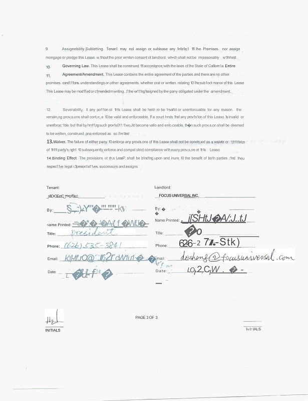 9. Assignebility Subletting. Tenan1 may nol assign or sublease any 1n1e1e;.1 111 lhe Premises. nor assign mongage or pledge this Lease. w,1hout the prior wrnten consent of landlord. wh•ch shall not be mreasonably w1lhheld 1 0 . 11. Governing Law. This Lease shall be construed 111 accordance with the laws of lhe Stale of Calllorn1a Entire Agreement/Amendment. This Lease contains the entire agreement of the parties and there are no other promises . cond 111 ons . understandings or other agreements . whether oral or wrrtten . relating 10 1 he sub 1 oct manor of this Lease This Lease may be mod 1 f,ed or c 1 mended rn writing . ,f the wr 111 ng 1 s signed by the pany obligated under the amendment . 12. Severabillt y . II any po1!1on ol 1h1s Lease shall be held ro be 1nval1cl or unentorcuable tor any reason. the remain ng prov,s,ons shall cont,n ; ,e 10 be valid and enforceable . If a court hnds 1 ha 1 any prov 1 s 1 on of this Leaso 1 s invalid or unenforce :: 1 ble . but thal by hm 11 ,ng such prov 1 s, 011 1 ! wo . Jld become vallo and enlo,ceable . th ೦ n such prov,s,on shall be deemed to be written . construed . ana enforced as so l 1 m 1 ted 13. Waiver . The failure of either pany 10 enlorce any provis,ons of this Lease shall not be construed as a waiver or 1 , 11111 a 1 ,on of 1 h 111 party's ngh 1 10 subsequently enforce and compel strict com p liance wi 1 h every prov,s,on ot 1 h 1 s Leaso 14. B inding Effect . The provisions ot rh,s LeasP . shall be b 1 nd 1 ng upon and inure 10 the benefit of bo 1 h parties :: 1 nd lheu respec 11 ve legal r, 3 preson 1 a 11 ves . successors and assigns L andlord: FOCUS UNIVERSAL INC. Tenant: _..:::, A ....&O<O..,,E.,, L c,: E .,.C.,_ T :..,. RO =.,. N ,.,. 1C "'S:.., L :.:, L ,.,. C :...... --- ------ By : ' ...,.. ::) - + - ' - Y '""' ೦ - " - ' -- " - "" - - k V N ame Printed: - = e ೦ * , ೦ - ' ೦ A - ) {' _ f _ ೦ W fJ ೦ -- By: ೦ ೦ ೦ Name Printed: ._j[SHtJ ೦ A/:J..tJ Email: Date: _ L ೦ - / ' J .:.... . - f ೦ Title: Phone: ೦ o 62 - 6 - 2 7 7 - . - - Stk) k';(l - /tf' ..rO@ .. I r,2r cW1u1· ೦ - ೦ \ r' r Date:_ ' LO I ..2,.C I W. ೦ - - PAGE 3 OF 3 INITIALS I N I T IALS