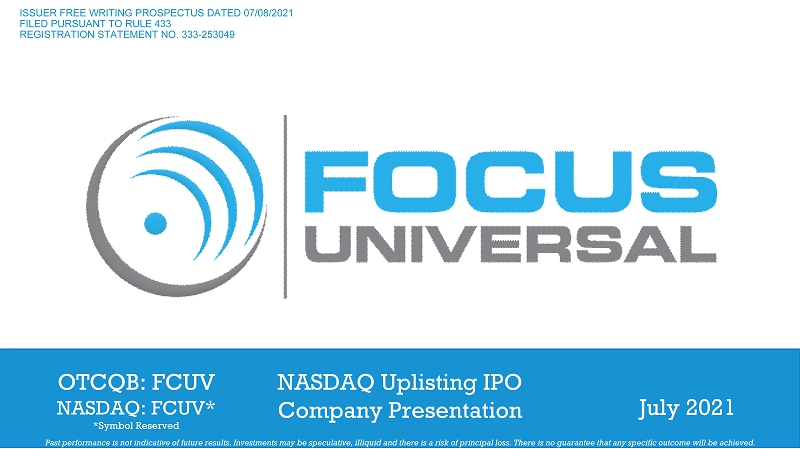 Past performance is not indicative of future results. Investments may be speculative, illiquid and there is a risk of princip al loss. There is no guarantee that any specific outcome will be achieved. ISSUER FREE - WRITING PROSPECTUS, CAUTIONARY STATEMENT CONCERNING FORWARD - LOOKING STATEMENTS 2 Filed pursuant to Rule 433 of the Securities Act of 1933 , as amended . This free writing prospectus related to the proposed initial public offering of ordinary shares of Focus Universal Inc . (“FCUV” or the “Company””), which are being registered on a Registration Statement on Form S - 1 (File No . 333 - 253049 ) (the “Registration Statement”) . The Registration Statement has not yet been declared effective . Before you invest, you should read the prospectus in the Registration Statement (including the risk factors described therein) and other documents FCUV has filed with the United States Securities and Exchange Commission (“SEC”) for more complete information about FCUV and the proposed offering . You may get these documents for free by visiting EDGAR on the SEC web site at www . sec . gov . Alternatively, FCUV and any underwriter or dealer participating in the offering will arrange to send you the prospectus if you request it by calling Boustead Securities, LLC at 949 . 502 . 4408 or by email at offerings@boustead 1828 . com or standard mail at Boustead Securities, LLC, Attn : Equity Capital Markets, 6 Venture, Suite 395 , Irvine, CA 92618 , USA . This document contains forward - looking statements . In addition, from time to time, we or our representatives may make forward - looking statements orally or in writing . We base these forward - looking statements on our expectations and projections about future events, which we derive from the information currently available to us . Such forward - looking statements relate to future events or our future performance, including : our financial performance and projections ; our growth in revenue and earnings ; and our business prospects and opportunities . You can identify forward - looking statements by those that are not historical in nature, particularly those that use terminology such as “may,” “should,” “expects,” “anticipates,” “contemplates,” “estimates,” “believes,” “plans,” “projected,” “predicts,” “potential,” or “hopes” or the negative of these or similar terms . In evaluating these forward - looking statements, you should consider various factors, including : our ability to change the direction of the Company ; our ability to keep pace with new technology and changing market needs ; and the competitive environment of our business . These and other factors may cause our actual results to differ materially from any forward - looking statement . Forward - looking statements are only predictions . The forward - looking events discussed in this document and other statements made from time to time by us or our representatives, may not occur, and actual events and results may differ materially and are subject to risks, uncertainties and assumptions about us . We are not obligated to publicly update or revise any forward - looking statement, whether as a result of uncertainties and assumptions, the forward - looking events discussed in this document and other statements made from time to time by us or our representatives might not occur . See offering documents for further risks and disclosures . Past performance is not indicative of future results . There is now guarantee that any specific outcome will be achieved . Investments may be speculative, illiquid and there is a total risk of loss . Form CRS/Reg BI Disclaimer : Boustead Securities, LLC is registered with the Securities and Exchange Commission (SEC) as a broker - dealer and is a member of the Financial Industry Regulatory Authority (FINRA) and the Securities Investor Protection Corporation (SIPC) . Brokerage and investment advisory services and fees differ and it is important for you to understand these differences . Free and simple tools are available to research firms and financial professionals at Investor . gov/CRS, which also provides educational materials about broker - dealers, investment advisers, and investing . When we provide you with a recommendation, we have to act in your best interest and not put our interest ahead of yours . At the same time, the way we make money creates a conflict with your interests . Please strive to understand and ask us about these conflicts because they can affect the recommendations we provide you . There are many risks involved with investing . For Boustead Securities customers and clients, please see our Regulation Best Interest Relationship Guide on the Form CRS Reg BI page on our website at https : //www . boustead 1828 . com/form - crs - reg - bi . For FlashFunders’ visitors, you may review the Form CRS of Boustead Securities under the Form CRS section . Please also carefully review and verify the accuracy of the information you provide us on account applications, subscription documents and others . © 2021