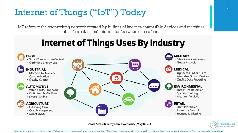 Past performance is not indicative of future results. Investments may be speculative, illiquid and there is a risk of princip al loss. There is no guarantee that any specific outcome will be achieved. IoT refers to the overarching network created by billions of internet - compatible devices and machines that share data and information between each other. Internet of Things (“IoT”) Today 4 Photo Credit: samyakinfotech.com (May 2021)