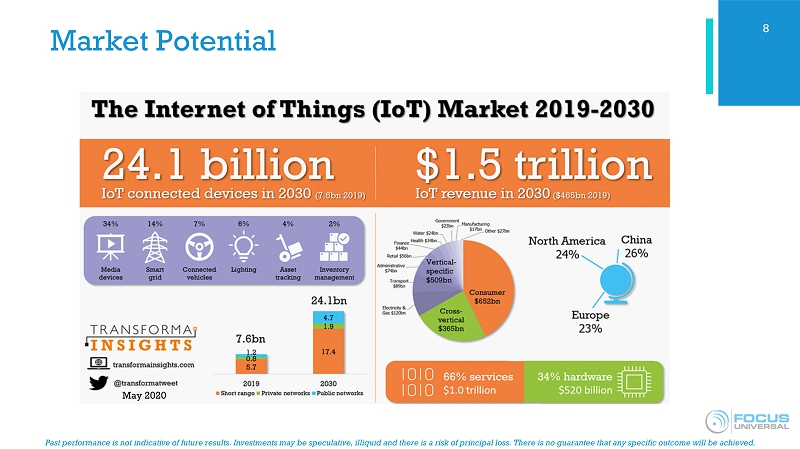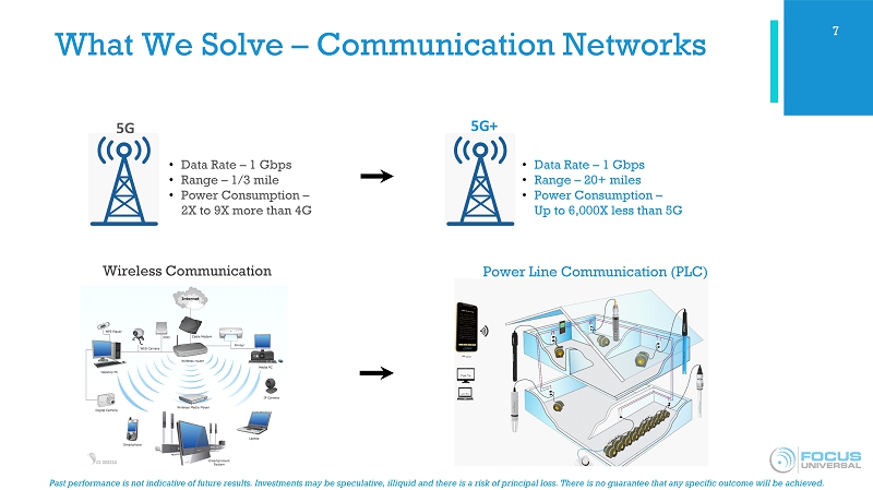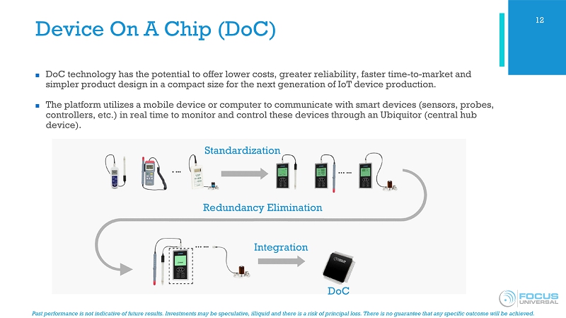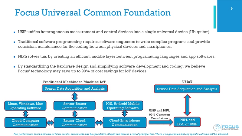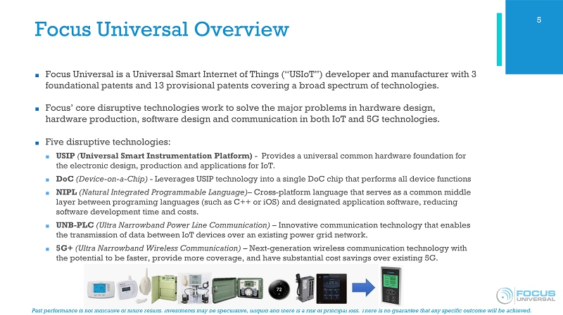 Past performance is not indicative of future results. Investments may be speculative, illiquid and there is a risk of princip al loss. There is no guarantee that any specific outcome will be achieved. Focus Universal Overview ■ Focus Universal is a Universal Smart Internet of Things (“ USIoT ”) developer and manufacturer with 3 foundational patents and 13 provisional patents covering a broad spectrum of technologies. ■ Focus’ core disruptive technologies work to solve the major problems in hardware design, hardware production, software design and communication in both IoT and 5G technologies. ■ Five disruptive technologies: ■ USIP ( Universal Smart Instrumentation Platform) - Provides a universal common hardware foundation for the electronic design, production and applications for IoT. ■ DoC (Device - on - a - Chip) - Leverages USIP technology into a single DoC chip that performs all device functions ■ NIPL (Natural Integrated Programmable Language) – Cross - platform language that serves as a common middle layer between programing languages (such as C++ or iOS) and designated application software, reducing software development time and costs. ■ UNB - PLC (Ultra Narrowband Power Line Communication) – Innovative communication technology that enables the transmission of data between IoT devices over an existing power grid network. ■ 5G+ (Ultra Narrowband Wireless Communication) – Next - generation wireless communication technology with the potential to be faster, provide more coverage, and have substantial cost savings over existing 5G. 5