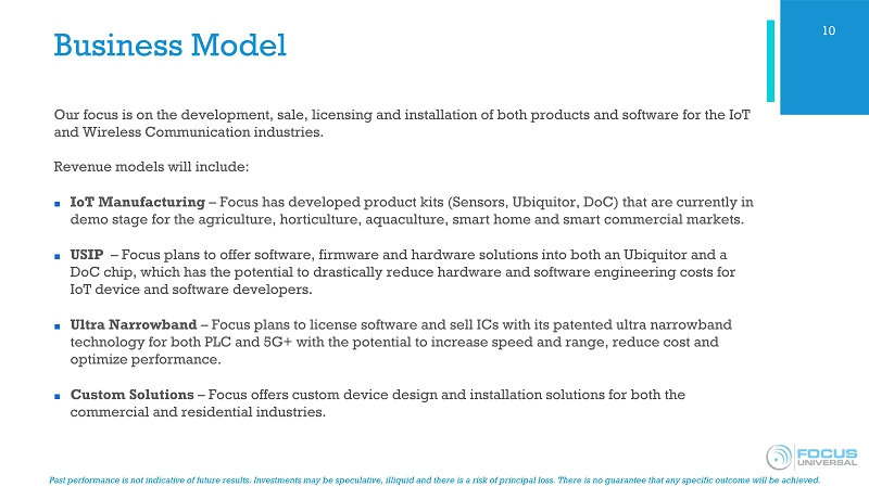 Past performance is not indicative of future results. Investments may be speculative, illiquid and there is a risk of princip al loss. There is no guarantee that any specific outcome will be achieved. Focus Universal Common Foundation ■ USIP unifies heterogeneous measurement and control devices into a single universal device ( Ubiquitor ). ■ Traditional software programming requires software engineers to write complex programs and provide consistent maintenance for the coding between physical devices and smartphones. ■ NIPL solves this by creating an efficient middle layer between programming languages and app softwares . ■ By standardizing the hardware design and simplifying software development and coding, we believe Focus’ technology may save up to 90% of cost savings for IoT devices. 9 Sensor - Router Communication Cloud - Smartphone Communication Cloud - Computer Communication Router - Cloud Communication IOS, Android Mobile Operating Software NIPL and DoC or USIP Sensor Data Acquisition and Analysis USIoT Traditional Machine to Machine IoT Linux, Windows, Mac Operating Software USIP and NIPL 90% Common Foundation Sensor Data Acquisition and Analysis