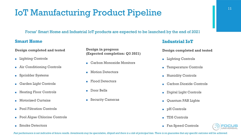 Past performance is not indicative of future results. Investments may be speculative, illiquid and there is a risk of princip al loss. There is no guarantee that any specific outcome will be achieved. Business Model Our focus is on the development, sale, licensing and installation of both products and software for the IoT and Wireless Communication industries. Revenue models will include: ■ IoT Manufacturing – Focus has developed product kits (Sensors, Ubiquitor , DoC ) that are currently in demo stage for the agriculture, horticulture, aquaculture, smart home and smart commercial markets. ■ USIP – Focus plans to offer software, firmware and hardware solutions into both an Ubiquitor and a DoC chip, which has the potential to drastically reduce hardware and software engineering costs for IoT device and software developers. ■ Ultra Narrowband – Focus plans to license software and sell ICs with its patented ultra narrowband technology for both PLC and 5G+ with the potential to increase speed and range, reduce cost and optimize performance. ■ Custom Solutions – Focus offers custom device design and installation solutions for both the commercial and residential industries. 10