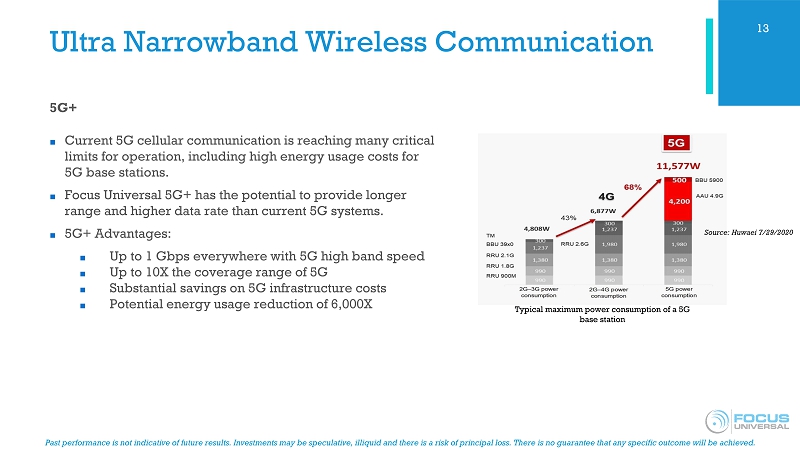 Past performance is not indicative of future results. Investments may be speculative, illiquid and there is a risk of princip al loss. There is no guarantee that any specific outcome will be achieved. 5G+ ■ Current 5G cellular communication is reaching many critical limits for operation, including high energy usage costs for 5G base stations. ■ Focus Universal 5G+ has the potential to provide longer range and higher data rate than current 5G systems. ■ 5G+ Advantages: ■ Up to 1 Gbps everywhere with 5G high band speed ■ Up to 10X the coverage range of 5G ■ Substantial savings on 5G infrastructure costs ■ Potential energy usage reduction of 6,000X Ultra Narrowband Wireless Communication 13 Typical maximum power consumption of a 5G base station Source: Huwaei 7/29/2020