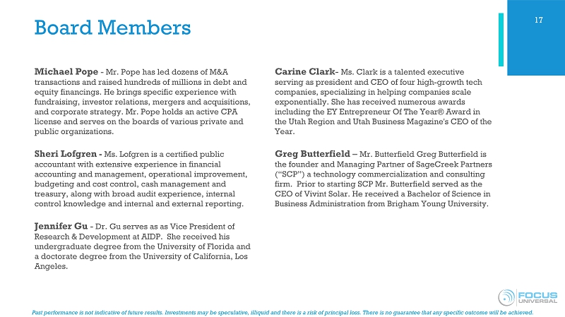 Past performance is not indicative of future results. Investments may be speculative, illiquid and there is a risk of princip al loss. There is no guarantee that any specific outcome will be achieved. Management Dr. Desheng Wang – CEO and Founder - Dr. Wang served as a senior research fellow at California Institute of Technology from 1994 - 2011. He holds a Masters degree from Dalian Institute of Chemical Physics at the Chinese Academy of Science and a Ph.D. in Chemistry at Emory University in 1994. Dr. Edward Lee – Chairman of Board and Founder – Dr. Lee also serves as Chief Executive Officer of AIDP, Inc. and served as its President. He received his undergraduate degree from Lanzhou University, a graduate degree from the University of Science & Technology of China and a doctorate degree from the University of Florida. Duncan Lee – Mr. Lee is the CFO. He is a licensed Certified Public Accountant and graduated in 2006 with a bachelor’s degree in Accounting from the University of Southern California and has more than 11 years of experience with public company accounting and financial reporting with the SEC. 16
