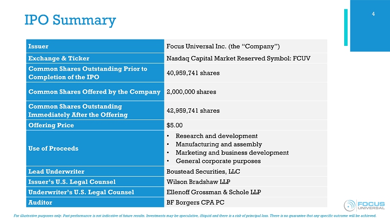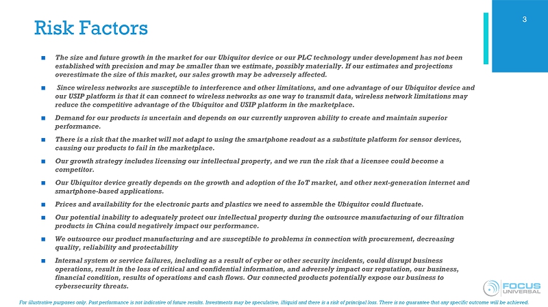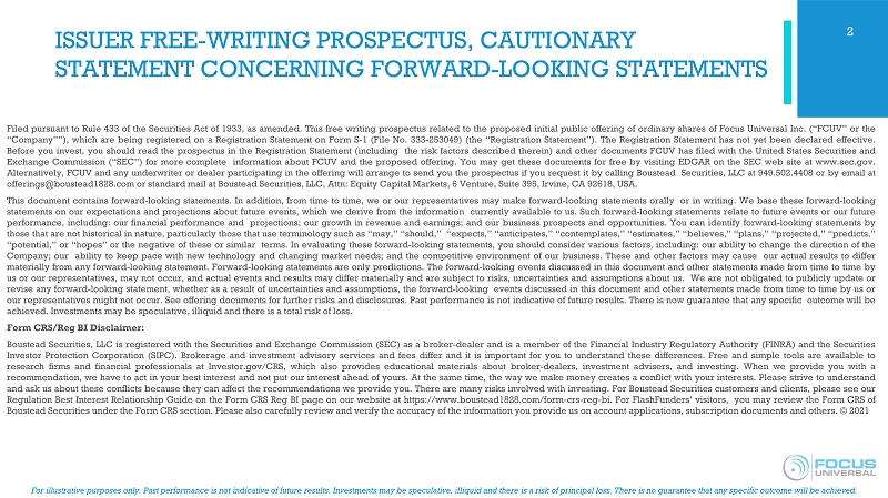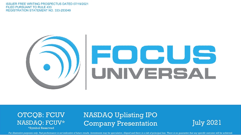For illustrative purposes only. Past performance is not indicative of future results. Investments may be speculative, illiqui d a nd there is a risk of principal loss. There is no guarantee that any specific outcome will be achieved. ISSUER FREE - WRITING PROSPECTUS, CAUTIONARY STATEMENT CONCERNING FORWARD - LOOKING STATEMENTS 2 Filed pursuant to Rule 433 of the Securities Act of 1933 , as amended . This free writing prospectus related to the proposed initial public offering of ordinary shares of Focus Universal Inc . (“FCUV” or the “Company””), which are being registered on a Registration Statement on Form S - 1 (File No . 333 - 253049 ) (the “Registration Statement”) . The Registration Statement has not yet been declared effective . Before you invest, you should read the prospectus in the Registration Statement (including the risk factors described therein) and other documents FCUV has filed with the United States Securities and Exchange Commission (“SEC”) for more complete information about FCUV and the proposed offering . You may get these documents for free by visiting EDGAR on the SEC web site at www . sec . gov . Alternatively, FCUV and any underwriter or dealer participating in the offering will arrange to send you the prospectus if you request it by calling Boustead Securities, LLC at 949 . 502 . 4408 or by email at offerings@boustead 1828 . com or standard mail at Boustead Securities, LLC, Attn : Equity Capital Markets, 6 Venture, Suite 395 , Irvine, CA 92618 , USA . This document contains forward - looking statements . In addition, from time to time, we or our representatives may make forward - looking statements orally or in writing . We base these forward - looking statements on our expectations and projections about future events, which we derive from the information currently available to us . Such forward - looking statements relate to future events or our future performance, including : our financial performance and projections ; our growth in revenue and earnings ; and our business prospects and opportunities . You can identify forward - looking statements by those that are not historical in nature, particularly those that use terminology such as “may,” “should,” “expects,” “anticipates,” “contemplates,” “estimates,” “believes,” “plans,” “projected,” “predicts,” “potential,” or “hopes” or the negative of these or similar terms . In evaluating these forward - looking statements, you should consider various factors, including : our ability to change the direction of the Company ; our ability to keep pace with new technology and changing market needs ; and the competitive environment of our business . These and other factors may cause our actual results to differ materially from any forward - looking statement . Forward - looking statements are only predictions . The forward - looking events discussed in this document and other statements made from time to time by us or our representatives, may not occur, and actual events and results may differ materially and are subject to risks, uncertainties and assumptions about us . We are not obligated to publicly update or revise any forward - looking statement, whether as a result of uncertainties and assumptions, the forward - looking events discussed in this document and other statements made from time to time by us or our representatives might not occur . See offering documents for further risks and disclosures . Past performance is not indicative of future results . There is now guarantee that any specific outcome will be achieved . Investments may be speculative, illiquid and there is a total risk of loss . Form CRS/Reg BI Disclaimer : Boustead Securities, LLC is registered with the Securities and Exchange Commission (SEC) as a broker - dealer and is a member of the Financial Industry Regulatory Authority (FINRA) and the Securities Investor Protection Corporation (SIPC) . Brokerage and investment advisory services and fees differ and it is important for you to understand these differences . Free and simple tools are available to research firms and financial professionals at Investor . gov/CRS, which also provides educational materials about broker - dealers, investment advisers, and investing . When we provide you with a recommendation, we have to act in your best interest and not put our interest ahead of yours . At the same time, the way we make money creates a conflict with your interests . Please strive to understand and ask us about these conflicts because they can affect the recommendations we provide you . There are many risks involved with investing . For Boustead Securities customers and clients, please see our Regulation Best Interest Relationship Guide on the Form CRS Reg BI page on our website at https : //www . boustead 1828 . com/form - crs - reg - bi . For FlashFunders’ visitors, you may review the Form CRS of Boustead Securities under the Form CRS section . Please also carefully review and verify the accuracy of the information you provide us on account applications, subscription documents and others . © 2021