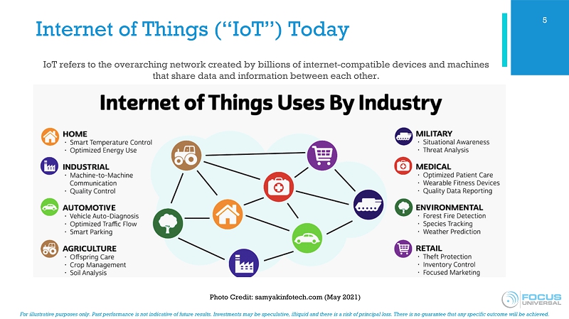 For illustrative purposes only. Past performance is not indicative of future results. Investments may be speculative, illiqui d a nd there is a risk of principal loss. There is no guarantee that any specific outcome will be achieved. IoT refers to the overarching network created by billions of internet - compatible devices and machines that share data and information between each other. Internet of Things (“IoT”) Today 5 Photo Credit: samyakinfotech.com (May 2021)