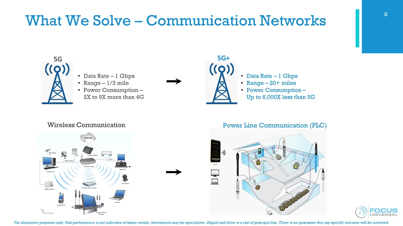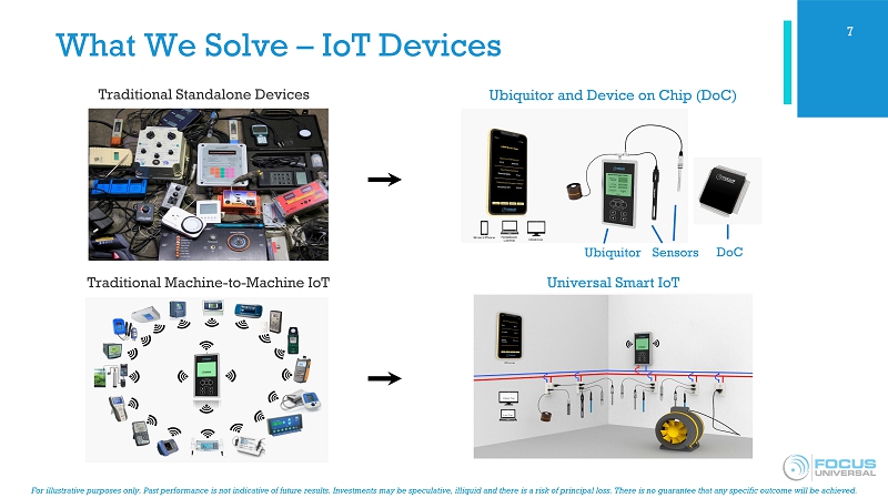 For illustrative purposes only. Past performance is not indicative of future results. Investments may be speculative, illiqui d a nd there is a risk of principal loss. There is no guarantee that any specific outcome will be achieved. Focus Universal Overview ■ Focus Universal is a Universal Smart Internet of Things (“ USIoT ”) developer and manufacturer with 3 foundational patents and 13 provisional patents covering a broad spectrum of technologies. ■ Focus’ core disruptive technologies work to solve the major problems in hardware design, hardware production, software design and communication in both IoT and 5G technologies. ■ Five disruptive technologies: ■ USIP ( Universal Smart Instrumentation Platform) - Provides a universal common hardware foundation for the electronic design, production and applications for IoT. ■ DoC (Device - on - a - Chip) - Leverages USIP technology into a single DoC chip that performs all device functions ■ NIPL (Natural Integrated Programmable Language) – Cross - platform language that serves as a common middle layer between programing languages (such as C++ or iOS) and designated application software, reducing software development time and costs. ■ UNB - PLC (Ultra Narrowband Power Line Communication) – Innovative communication technology that enables the transmission of data between IoT devices over an existing power grid network. ■ 5G+ (Ultra Narrowband Wireless Communication) – Next - generation wireless communication technology with the potential to be faster, provide more coverage, and have substantial cost savings over existing 5G. 6