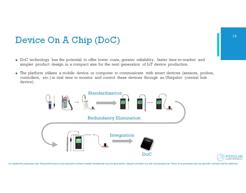 For illustrative purposes only. Past performance is not indicative of future results. Investments may be speculative, illiqui d a nd there is a risk of principal loss. There is no guarantee that any specific outcome will be achieved. Device On A Chip ( DoC ) ■ DoC technology has the potential to offer lower costs, greater reliability, faster time - to - market and simpler product design in a compact size for the next generation of IoT device production. ■ The platform utilizes a mobile device or computer to communicate with smart devices (sensors, probes, controllers, etc.) in real time to monitor and control these devices through an Ubiquitor (central hub device). 13 Standardization Redundancy Elimination Integration DoC