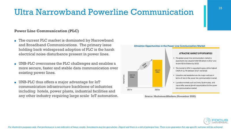 For illustrative purposes only. Past performance is not indicative of future results. Investments may be speculative, illiqui d a nd there is a risk of principal loss. There is no guarantee that any specific outcome will be achieved. 5G+ ■ Current 5G cellular communication is reaching many critical limits for operation, including high energy usage costs for 5G base stations. ■ Focus Universal 5G+ has the potential to provide longer range and higher data rate than current 5G systems. ■ 5G+ Advantages: ■ Up to 1 Gbps everywhere with 5G high band speed ■ Up to 10X the coverage range of 5G ■ Substantial savings on 5G infrastructure costs ■ Potential energy usage reduction of 6,000X Ultra Narrowband Wireless Communication 14 Typical maximum power consumption of a 5G base station Source: Huwaei 7/29/2020