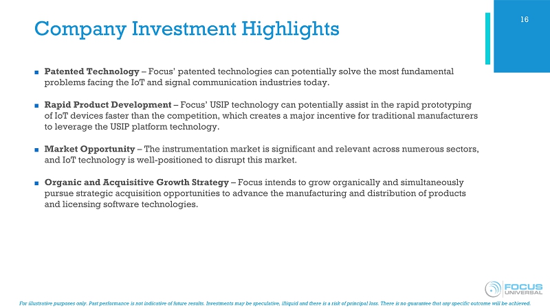 For illustrative purposes only. Past performance is not indicative of future results. Investments may be speculative, illiqui d a nd there is a risk of principal loss. There is no guarantee that any specific outcome will be achieved. Company Investment Highlights ■ Patented Technology – Focus’ patented technologies can potentially solve the most fundamental problems facing the IoT and signal communication industries today. ■ Rapid Product Development – Focus’ USIP technology can potentially assist in the rapid prototyping of IoT devices faster than the competition, which creates a major incentive for traditional manufacturers to leverage the USIP platform technology. ■ Market Opportunity – The instrumentation market is significant and relevant across numerous sectors, and IoT technology is well - positioned to disrupt this market. ■ Organic and Acquisitive Growth Strategy – Focus intends to grow organically and simultaneously pursue strategic acquisition opportunities to advance the manufacturing and distribution of products and licensing software technologies. 16