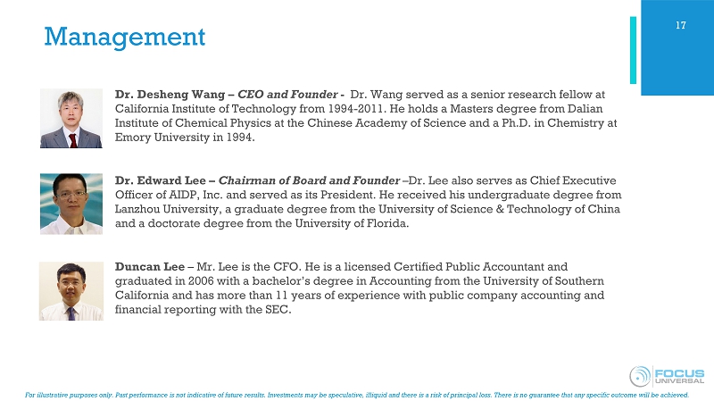For illustrative purposes only. Past performance is not indicative of future results. Investments may be speculative, illiqui d a nd there is a risk of principal loss. There is no guarantee that any specific outcome will be achieved. Management Dr. Desheng Wang – CEO and Founder - Dr. Wang served as a senior research fellow at California Institute of Technology from 1994 - 2011. He holds a Masters degree from Dalian Institute of Chemical Physics at the Chinese Academy of Science and a Ph.D. in Chemistry at Emory University in 1994. Dr. Edward Lee – Chairman of Board and Founder – Dr. Lee also serves as Chief Executive Officer of AIDP, Inc. and served as its President. He received his undergraduate degree from Lanzhou University, a graduate degree from the University of Science & Technology of China and a doctorate degree from the University of Florida. Duncan Lee – Mr. Lee is the CFO. He is a licensed Certified Public Accountant and graduated in 2006 with a bachelor’s degree in Accounting from the University of Southern California and has more than 11 years of experience with public company accounting and financial reporting with the SEC. 17