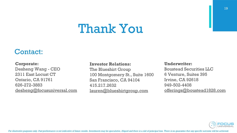 For illustrative purposes only. Past performance is not indicative of future results. Investments may be speculative, illiqui d a nd there is a risk of principal loss. There is no guarantee that any specific outcome will be achieved. 19 Underwriter: Boustead Securities LLC 6 Venture, Suites 395 Irvine, CA 92618 949 - 502 - 4408 offerings@boustead1828.com Corporate: Desheng Wang - CEO 2311 East Locust CT Ontario, CA 91761 626 - 272 - 3883 desheng@focusuniversal.com Contact: Thank You Investor Relations: The Blueshirt Group 100 Montgomery St., Suite 1600 San Francisco, CA 94104 415.217.2632 lauren@blueshirtgroup.com