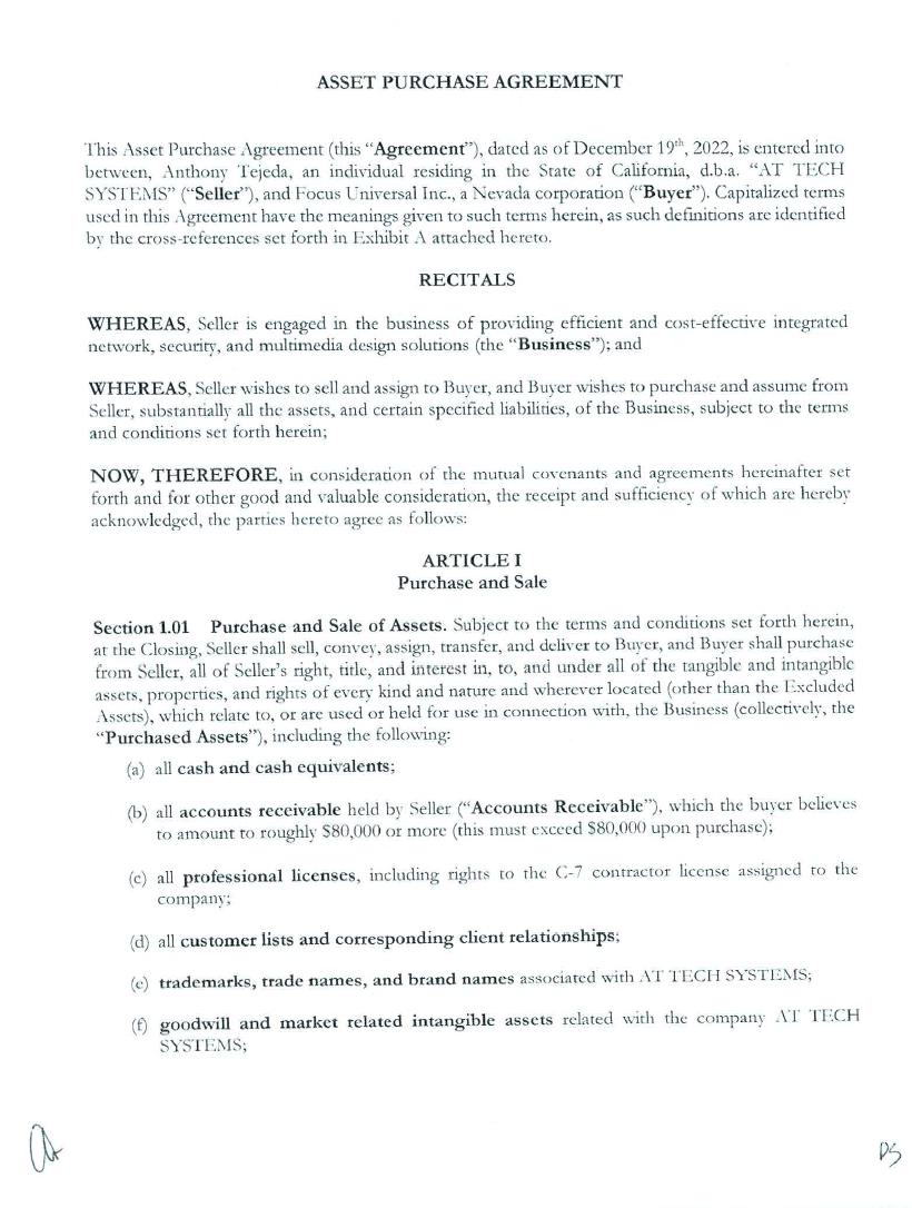 ASSET PURCHASE AGREEMENT This ! \ sset Purcha se , \ gre eme nt (t his " Agreement "), d ated as of December 19 1 1 \ 2022 , is entered into between, , \ nth ony Tejeda, a n incfo - idual residing in the State of Ca li forn i a, d . b . a . " .. - \ T TEC H SYST F l \ ( S" (" Seller "), an <l Focus L·ni, - e r sal I nc . , a Nevada co rp o rari on (" Buyer ") . Capitafo : ed terms used in this . - \ gree menr have the meanings gi , ·en to s u ch te r ms herein, as such definitions arc identified by the c r oss - references set forth in Exhibit _ \ attached hereto . RECITALS WHEREAS , Seller is engaged in t h e business of pro \ ·iJing effic i enr and cosr - effect . iYe integrated ne r ,vork, sec urity , and mu l timedia design so lution s (the " Business ") ; and WHEREAS , Seller wishes to se ll and assign to B uyer, and uyer wis h es to purchase a nd assume from S eller, s ubsrnntially all the assets, and certain s p ec i fied 1 . ia b il iries, of rhe Business, subject ru the terms and co nditi u n s set forth h ere in ; NOW, THEREFORE , in comiderntion of the mumal cm·cnants and agr ee ment s hereinafter set fo rth a nd for othe r goo d and valuable co n s id eration, the receipt and sufficiency of wh i c h arc here!), · acknowkdgcd, the parrit : s heret o agree as follows : ARTICLE I Pur c ha se and Sale Section 1 . 01 Purchase and Sal e of Assets . Su b ject to the terms and conditions set forrh herein, art h e C l osing, Se ll er s hall se ll , com·cy, ass i gn, tra n sfer, and dc li \ ·er to B uyer, and Buyer shall purchase from Seller, all of Seller's r i ghc, tirk, and int e r es t in, t o, and w 1 dcr all of the tangible and intangible as sets, properties, and rights of every kind and n a t u r e and whc r eYc r located (or h er than the F . xclu<lcd . \ ssc ts ), ,vh . ic h rc . .: l ate to, o r arc u se d or h e ld fo r use in co nn ectjon with, the Business (co l kctin· l y, the " Purchas e d Assets "), including the fo ll o \ \ ·i . ng : (a) all c a s h and cas h equivalents ; (b) all accounts r ece ivable held b y Seller (" Accounts Re ce ivabl e "), which the buyer belieYes to amoum t o roughly S80,000 or murc (t his must exceed S80,000 upon pur c h ase); (c) a ll prof ess i o nal lic e nse s , including righr to rhe C - 7 co n rrncror li ce n se assigned ro the company; (d) all customer lists and corresponding clie nt relation s hips ; (e) trad e m a rk s, trade names, and br a nd name s associated wit h . \ T TEC f r S Y S TL::.i \ f S; (f) goo d w ill and mark e t rel ate d intangibl e assets related with rhc co mpany . \ T TFCH S Y S TEi \ lS ;
