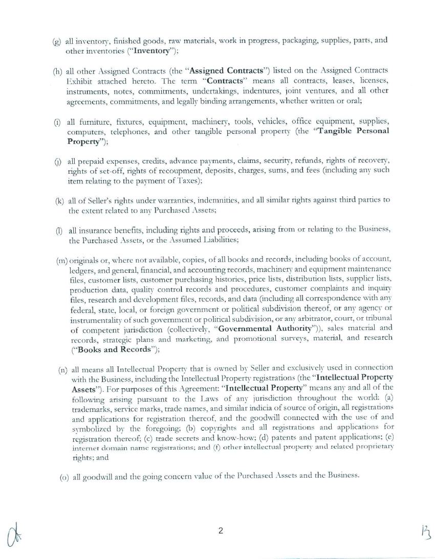 (g) all i . i 1 Yc 11 tory, fmi s h e d goods, raw mate . ri a l s, ,v ork in pro gress, p ackaging, st 1 pplie s, parts, an<l other inY entorics (" In ve nt ory' ') ; 1) all othe r , \ ssigned Contrac t s ( the " As s i g n e d C o ntr a ct s ") l i sted o n the Ass ign ed Contrac t s Exhibit attached h ereto . The rerm " Co ntr ac t s" means all contracts, lea ses, li ce n ses, in stru ment s, notes, commi tment s, undertakings , i ndentures, joint YCnturcs, and a ll othe r agreements, commitments, a nd lega ll y b i ndin g arrange m e nt s, ,vhcther written or ora l ; (i) all furniture, fo ;. turc s, equ i pme n t, ma chine r y, tools , \ ·c hicl es, office equip m ent, s uppli es, co mputer s, telephones, and ot h er t angible per sonal property (t he " T ang ib l e P erso n a l Pr o p e r ty ") ; 0 ) all prepaid expen s e s, credits, ad va n ce payments, claims, security, refunds, rights of re covery, ri g ht s of set - off, 1 ights of re cou pment , deposits, charges, su m s, and fees ( including any s u c h item relating to tl 1 e p ayme nt of Taxes ) ; (k) all of Se ll e r 's 1i g ht s Lmd er warrantie s, ind emnities, and all si mil ar rights aga in st tlur<l parties to die extent relate d to an · Pur c h ased . \ ssets; 0 ) a ll ins urance ben efits, including tight s and proceeds, a ri s in g fr om or relating to the Rusinc!,S , the Pur c ha se d _ \ ss et s, or the . \ ssumed Liabi liti es ; (m) origi n a l s or, where not a, · ailablc , copies, of all book s and records, including books o f account, l edgers, and general, financial, and acco u nting record s, rn achinery and eguip m c nt maintenance fi le s, c u stome r li s ts, c u sto m e r purcha si n g histories , price li s ts, distribution lists , s up plier lists , producrion d ata, qua li ty co ntr o l record s and procedures, custome r comp laii 1 ts and ingui . ry files, research and development files , r ecords, and data ( including all corresponde n ce with a n y fcdernl , state, . lo ca l , or foreign gO \ ·crnmen t or p o liti c al su bdivi s i o n thereof , or any agcnc · or in s trum e ntality of suc h gove rnm ent or political s ubdivi s i o n , o r anr a rbi trator, court, or tribunal of competent j uri s di ctio n (co llc c r i, · ely, " Gove rnm e nt a l A uth or i ty ")), s ale s ma teri al a n d records , strate g ic plan s and marketing , a n d p romotional su rYcy s, materia l , and re sea rch (" Boo k s a nd R eco rd s ") ; (n) a ll mean s all I n tellectual Pr ope rt y that i s o \ \ · ned by Se ll e r an<l exclusively used i n connection wi th t he Busi n ess, i ncluding the Int ellectual Property re g i stratio n s ( the " Int e ll ectua l P ro p e r ty Asse t s ") . For pu rp oses of t hi s , - \ grce m ent : " Int e ll ec tu a l P ro p erty " mean s any and all of r h e follmving arising pursua n t to the J ,aws of any jur i sdiction throughout the w o rld : (a) trademarks , serY - icc marks , trad e name s, and sim ilar indi c i a of source of or i g in , a ll registrations and applications for re gis trar . ion t h ereof, and the good, vill connecrc <l w i th the use of and svmbolizcd by the foregoi n g ; 0 ) ) copyrights and all registrntio n s and application s for regi str ati o n thereof ; (c) trade sec r ets and kn o w - h o w ; ( d ) patents a nd patent applicatio n s ; ( e ) int(· 1 · 1 u't dotn :: tin name rcgi , ; rrari ons : a nd ( t ) orhcr intt : Uccrual pr op< .: rt) · and n .: latcd propri etary ri g ht s ; and (o) a D good,v ill a nd the go in g concern , · aluc of t he Purcha s ed . \ ssets an<l the Bu s iness . 2