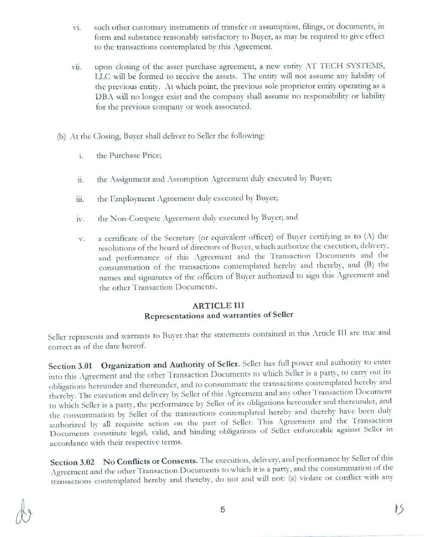 n . such or h er customary instruments of transfer or assumption, filing s , or docum e nt s , in form an<l substance rca so nabl r s atisfa c tory to Buyer, as ma y be r e quir e d to gin : effect ro t h e rrn n saccions contemp l are<lby this . \ greeme n t . 5 , • u. up o n closi n g of the asset pur c h ase agreement, a new entiry : \ T TEC H SYSTE [S LLC \ vill be formed to r eceiYe the as sets . The cncit : ,, - will n ·o t assume am· liability of t h e pre , · ious e nti ty . , \ ,rvhic h po i nt , the previou s so l p roprietor entit)' operati n g . as a DB . \ will n o long e r exist and th e company s hall as s ume no re s pon si bilin · or liabi li n · for t h e p reviou s company or work assoc i ated. · , 0)) . \ t rhcClosing, 13uycr shall deli, · er to Se ll er the follo \ \ 'ing : 1. th e Pur c ha se Price ; u. the . \ ssignment and . \ ss umption . \ greemenr dul y executed by Buy er; w. rhe Employment . \ gr ee menr du l y executed by Buye r ; 1 v. the on - Compete . \ grecment dul y executed by Buy e r ; a nd , - . a ce rtificate of the Sec retary (o r equi,·aknt officer) of Buyer certifying as co (. \ ) rhc re so lution s of the board of dir ecto r s of Bu ye r , which a uthori z<.: the execu ti on, delin:r · , and performance of du :; . \ gr ec ment nn<l rhc Tran s a ction D ocu ment am l rhc consummation of the transactions co ntemplated her e by a n d t h ereb · , and (13 ) the name s and s i g n atures of the officers of B u · cr authorized to s i g n rhis _ \ g reem c nr and the o th er Tran sac ti o n D ocu ment s . ARTICL E III R e pr e sent a tion s a nd wa rr a ntie s o f Sell er S eller re p resents and warran ts ro Buyer that rhc state ment s contained in this . \ rticle I ll arc true a nd correct as of the d a r e h e re o f . Sec tion 3 . 01 Or g anization and Auth o ri ty o f S e ll e r . Seller has full p owe r and authority to enter int o thi s . \ grccmcnt and rhe orhcr Tra n s act . ion D ocu ment ::; ro \ \ 'hich Sel ler is a p arry, to carry out it s ob li g ation s lwr eu n<l er a n<lthereund e r , an <l co consummate chc transactions co nt em plated h e r e b y and rh < .: r c by . The exec u ti o n and dcli, · cry b · Se ller of rhi s . \ g rccmcnr and an y other Transacti o n D oc um e nt ro which Se ll e r i s a parr y, the performance b y Se ller of it s o bli gatio n s hereunder a nd ther e under , and the co nsumm ario n by Se ller o f rJ 1 c transactions co nt em pl a t e d her eby and thereby ha, c b ee n duly aurhori 7 . e d b y all requi s i te action o n t he pan of S eller . Thi s . \ gr ce m e nr a nd rhc Transaction Document s co nstitute l ega l , , · alid, a nd bi n ding obli ga cions of S clkr e nf orce able abr - iinsr Scl kr in accordance \ \ ' ith rheir re s pe ccin term s . S ec ti o n 3 . 0 2 N o Confli c t s or Co n se nt s. Th e exec uti o n. deli, · c1 - y, and pcrformnn ce br Se ll e r of thi s . \ gree m e nr and t he other T ra n saction Docume n t s ro which it i s n parr y, and the co nsummar jo n of th e transa c tion s co n t e mplat e d h e reby a nd thereby, <lo n ot and will n o r : ( a , ) · iolare o r co nflict with any