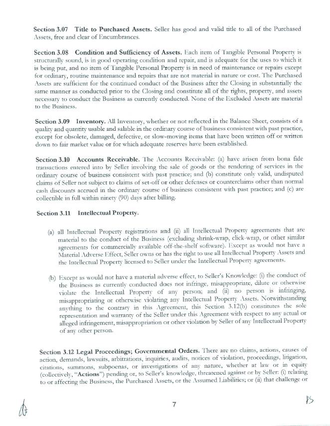 Section 3 . 07 Title to Purchased Assets . Seller has goo<l a n d valid title to all of the P urchased . \ sscts, free and clear of Encwn bra nccs . Section 3 . 08 Condition and Sufficiency of Assets . b \ ch i te m of Tangible Personal Propcrtr i s srructt u : a ll y sound, i s in gom 1 operating condition and repair , and is ade quate for the uses to which it is being put , and no item of T angible P e r so nal P roperty i s i n need of maintenance or t· epairs except for ordinary, routine mainrenance an d repairs t h at are not mat e rial in nature o r cost . The Purcha se d . - \ ssets arc s uffici e nt fo r the continued concluc r of the Business after the C l osing in substantially the same manner as co ndu cted pri or r o the Closing a nd consriruce all of t he Lights, property , an d assets nccessru : y to conduct the Bu siness as currently conducte d . . i one of the Exclu<le<l Assets are materia l to the Bu siness . Section 3 . 09 Inventory . A ll In vento r y, w h ether or not reflected in the Balance S heet , consis t s of a quality a nd qu a n tity u sa ble and sa l able in tl 1 c ordinary course o f busine ss consistent wit h past p rac tice, exce p t for obsole te , damaged, defective , or slow - mm - ing items t hat have been wr i tte n off or w ri tten d ow n to fair marker Yalue or for wh i ch adequate rese 1 Tes ha,·e been estab li shed . Section 3 . 10 Accounts Receivable . The . \ ccouncs R ccei \ 'able : (a) han : arisen from bona fide transact i ons entered into by Se l ler im·oh ; ng the sale of goo d s or the rendering of sen - ices in the ordinary c o ur se of busines s cons i stent with pa st practi ce ; and (b) co n sti tute on ly va lid , undi sp uted cla im s of Se ll er not su bj ect to claims of scr - off or ot h er defenses or co un te rcl aims othe r than normal cash discount s accrued in t h e ordi n ary comse of business co n s i stent with p ast practice ; and (c) arc collectible in full witlun ni nety ( 90 ) dars after billin g . Section 3.11 Intellectual Property. (a) all I ntc ll ecmal Pr operty regi sa: ati o ns and ( ii ) all I ntell ecrua l Pr o pert y ag r eements tl1at arc materi a l tC> the conduct of the B usi n ess ( excluding s hrink - wrap , click - ,, - rap, or o ther si milar agreem e nt s fo r co n unerciaUy arnilablc off - the - shelf soft ware ). 1 - '.xccpr as woul<l nor ha \ - e a [ \ fare ri al . \ c ke r se I ·'.ffect, Seller owns o r h as the ri ght to u se all lntclkc t ua1 P roperty . - \ sscts an d t h e lntcllcctual Prop e r ty lic ensed to Se ller und e r the In te ll ectua l Propeny agreements. l xcc pr a s ,vm1ld n or ha YCa materia l ach - ersc effect, ro Selle r' s Knowledge: ( i ) rhc co mluct of the Business as cm rcntlY conducrcJ doc s nor in fringe, tnisa pp ropriatc , dilute or othe rwi se Yiolare the In tc ll ccrual Pro p erty of any person; a nd ( ii ) no person i s infringin g, misapp ro priating or ot hcn, · ise \ · i o IBtin g any lnr e llcctual P ro p er ty . \ sscrs . Not wirhsranding a nythin g co the contrary in thi s . \ greeme nt, t hi s Sectio n 3 .1 2 ( b ) constitutes the sole representation and wa.rranry of t he Seller under this . \ greem enr with r e \ ' - pcct to any actual or a !J cged infringement , mi sa ppropriarion or other , - i oln ti o n by S eller of any Tnrellectual Property of any othe r person. Section 3 . 12 Lega l Proceedings ; Governmental Orders . There arc no claim , actions, causes of action, demands, law s uit s, arb i mnions, im 1 uir i es, audits , notices o , f · i o lati on, pro ceedi n gs, liri gatio n , c i tat i ons, su mmons , sub p oenas, or i . i 1 Y estigations of any naru 1 : e, whether at law or in e guir y ( collecLiYcly, " Actions ") pending or, to Selkr's kn O \ dc<lge, threate ned aga insr or by Selle r : ( i ) relating to or affec tin g t h e Bu si n ess, t h e P urchased . \ ssets, or the . \ ss um c d Liabilitie s ; or (i i ) th a t challenge or 7