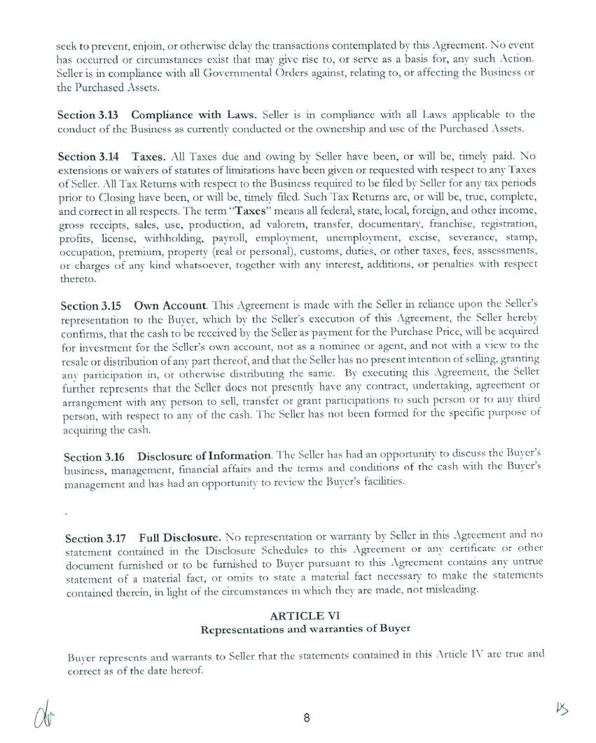 seek to pre \ ·ent, enjoin, or othC' nvi se delay the transactions conte mplat ed by r his . - \ grecmcnt . No event has occurred or circumstances exist chat may give rise ro, or sc rn : as a basis for, any such . \ crion . Seller is in compliance with all Governmental Orders against, relating to, or affecting the B mincss or the Purchased _, \ ssets . Section 3 . 13 C o mpliance with Laws . Seller is in comp lian ce w i th all Laws applicable to the co ndu ct of the Business as currently conducted or tl 1 e owners hip a n d use of the Purchased . \ sscrs . Section 3 . 14 T axes . r \ U Taxes due and ow in g by Se ller have been, or · will be, timely paid . No ex ten sions or wai, · ers of statutes of limitations have been give n or requested with respect to any Taxes of Seller . All Tax Returns with respect to the Business r ec . 1 uired to be filed by Seller for any tax periods prior to C lo sing ha ve b een, or will be, ti . mcly filed . Such Tax Returns are, or will be, true, complete, and correct in all respects . T he term "T axes " means all federal, s t ate, l ocal, foreign, a nd other income, gross receipts, sales, use, production, ad ,·alorem, tra n sfer, docu . n 1 entary, franchise, regi $ tration, profits, lic e n se, withholding, payroll, employment, unemp l oyment, excise, scYerancc, stamp, occupation, premium, property (real or personal), customs, dutie $ , or othe r taxes, fees, assessmcnrs, or charges of any kind whatsocn : r, together with any interest, additions, or penalties w i rh respect thereto . Section 3 . 15 Own Account . Thi : \ greemenr is made with the Selle r in reliance upon rhe Seller's representation to the Buyer, ,vhich by t h< .: Selle r 's execution of this . \ greement, the Seller hereb : · confirms, that the cash to be r eceived by the Seller as payment for the Purchase Price, will be acquired for i . i 1 Yestment for the Se ll er's own accou nt , not as a nominee or agent, and not ,, - ith a ,·iew to the re $ a l e or <listriburion of any part thereof, and that the Seller has n o present intention of selling, granting any participation in, or otherw i se distributing rhe same . I 3 y executing thi , s - \ grecmcnt, the Sc 11 er further represents that the Seller docs not presently ha \ 'C any contract, undertaking, agreement or auangemcnt with any person to sell, transfer or grant participations to such person or to any third person, \ \ , 1 . th n : specc to any of the cash . The Seller has not been formed for the specific pmposc of acquiring the cash . Section 3 . 16 Di s clo s ure oflnformation . The Seller has had an oppommity to discuss the Bu : ·cr's business, m anage ment , financial affairs an<l the terms and conditions of th e cash wir . h rhc Ru : ·cr's management and has ha<l an opportunir : · to re,·iew the Buyer's fa . cilitics . 8 Section 3 . 17 Full Di s clo s ure . No representation or y .; - arranty by Seller i . i 1 this . \ grecmcnt and no stat< .: mcnt contained in the Disclosure Schedub, to this . \ grecment or an : · certificate or ot h er document furnished or to be furnished to Buyer pursuant to this , \ grecmcnt contains any untrue statement of a material fact, or omits to srate a material fact necessary to make the statemcnrs contai . i 1 ed therein, in li gh t of the circ um stances in which they arc made, not misleading . ARTICLE VI Representations a nd warranties of Bu yer Buyer represents and warrants to Seller rhar the staremcnts contained in this . \ nick l \ ' arc rrue nn<l correct as of the .: <late h ereof .