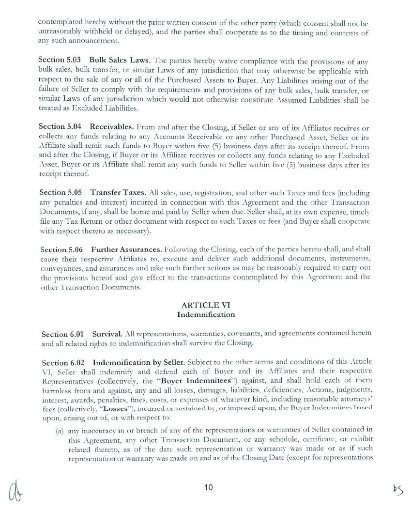 contemplat e d hereb y wid 10 ut the pri o r written consent of the ot he r party ( \ \ · hi c h conse nt shall n ot be unrea so nably ,virhhcld o r dela y ed), and th e parti es s hall cooperate as to the timing and co nt e nt s o f anysuc h announ ce m en t . Sec ti o n 5 . 0 3 Bulk S a le s L aws . The pa rties hereby wai, ·e co mplian c e wit h t h e provi si on s of a n bulk s ales , bulk tran sfe r , or s imilar J . aws of any jur i sdiction that may o th e rwis e be applicable wirh r es pec t to the sa le of a n y or a ll of the Purch ase d Assets to Bu ye r . r \ n y Liabilities arising out o f th e failur e of Se ller ro comply with the requirement s and pr o,· i s i o n s o f a ny bulk sa le s , bulk transfer , or s imi l ar J . aw s of an y jurisdiction wh i c h wou ld n o t oth e rwi s e c o n s titute . \ s s umed Liab iliti es sha ll be tr e ated a s Excluded T . iab il itie s . S e ction 5 . 04 R ece i v abl es . From a n d aft er the C lo s in g, if Se ll e r or any of it s ; \ ffiliatcs recciYe s or collects a n y fund s re l ating to an y 1 \ cco unts Rece inbk or a n y other Pu rc ha se d . · \ sse t, Se ll er o r in ; Affi li ate s hall remit s u c h funds to Buyer within five ( 5 ) bu siness day s a ft er its r ece ipt th ereof . Fro m a n<l after the C l osi n g, i f Bu ye r o r i ts 1 \ ffi liatc recciYe s or co l lect s any fund s relating to any Fxcluckd : \ set, Bu ye r o r it s : \ ffilia te s h all remit any s uch funds to Se ller wit h in fo ·e ( 5 ) bu s iness days afte r i t : reccipt ther eof . S ec ti on 5 . 0 5 T ran s f e r T ax es . All sales, use, r egistn 1 tion, a nd o th e r s u c h Taxes and fe es (incl udin g a ny p e nalti es and intere st) in cu rr e d in connecti o n witl, thi s 1 - \ grcc m cnt and the other Tran sa cti o n Docum e nt s, i f any , s hall b e borne and pai<l by S eller when due . Se ll er s hall , at it s ow n ex p e n se, tim ely file any Tax Return or o tl 1 er d o cument with res pect t o s uch Taxes or fee s (a nd Buyer s hall coo p erate with re s pect there to as ne cessary) . Sec ti o n 5 . 06 F u r th e r Ass u ra n ces . F o llowing the C l os in g, eac h of t he parties h ereto s hall, a nd shal l ca u s e tl 1 eir r cs p ccti,·e r \ ffi li ates t o, e x ecute and deliY e r s uch additio n a l document s, i nstruments . co 1 n - e \ 'a n ces, a n d a ss uran ces and take s n c h further actions as may be reasonably r eq u ire d t o cru - r · o m the p m· isi ons here o f and g i, · c effec t to the transactions contemplated by thi s . \ gr ee m e nr an d the o ther Transa c ti o n Document s . AR T IC L E VI Ind e mnifi ca ti o n S e c ti on 6 . 01 S u rv i v al • . \ ll repres e ntation s, warranties, co, - en ant s, and agreement s co nrained h ere in and al l relat e d ri g hts to ind emnificatio n s hall s un ; , • e th e C l osi ng . Sec ti o n 6 . 02 Ind e mnific atio n b y Se ll e r . Subject to t he o cher terms and cond iti o n s of thi s . \ rtic lc \ ' I , Sel ler s hall ind em ni fy and defend ea c h of Buy e r and i ts . \ fftliat es and th e ir r cspecti \ - C R e pr ese nt a ciYc s ( collectively, t h e " Bu ye r lnd e mnit ees ") aga in s t, and s h a ll h o ld eac h o f rhnn harmle ss from a nd aga i n st, any and all l oss es, damages, li abilities, d eficie n c i es, : \ c 6 o ns , j u <l g mcnt s . interest, award s, penaltie s, fme s, co s ts, or ex pense s o f whate, ·e r kind , includin g reasonable att or nc · s' f ees (co llc c ti \ · c :; l · , " Losse s"), i . n currc<l o r , ; u s t a in cd b - , or impos e d upon , th e 13 u yc r l n cl c .: mJ 1 ic cc : s based up o n, aris in g out of, or w ith re s pe c t to : (a) a 1 w inaccurac y in or breach of an y o f rhe representati o n s o r warranti es of Se ll e r co ntain e d in thi :; . · \ grecment, a n y o ther T ransaction D oc ument , o r a n y sc h e dule , ce rtificate , or exhibit related t h ereto, as o f t h e date such repre se ntation or warranty wa s made o r a s if s uch represc : nrar . ion o r warra nt y wa s made on and as of t he Clos in g Dat e (exce pt for r e pre senr . ations 10