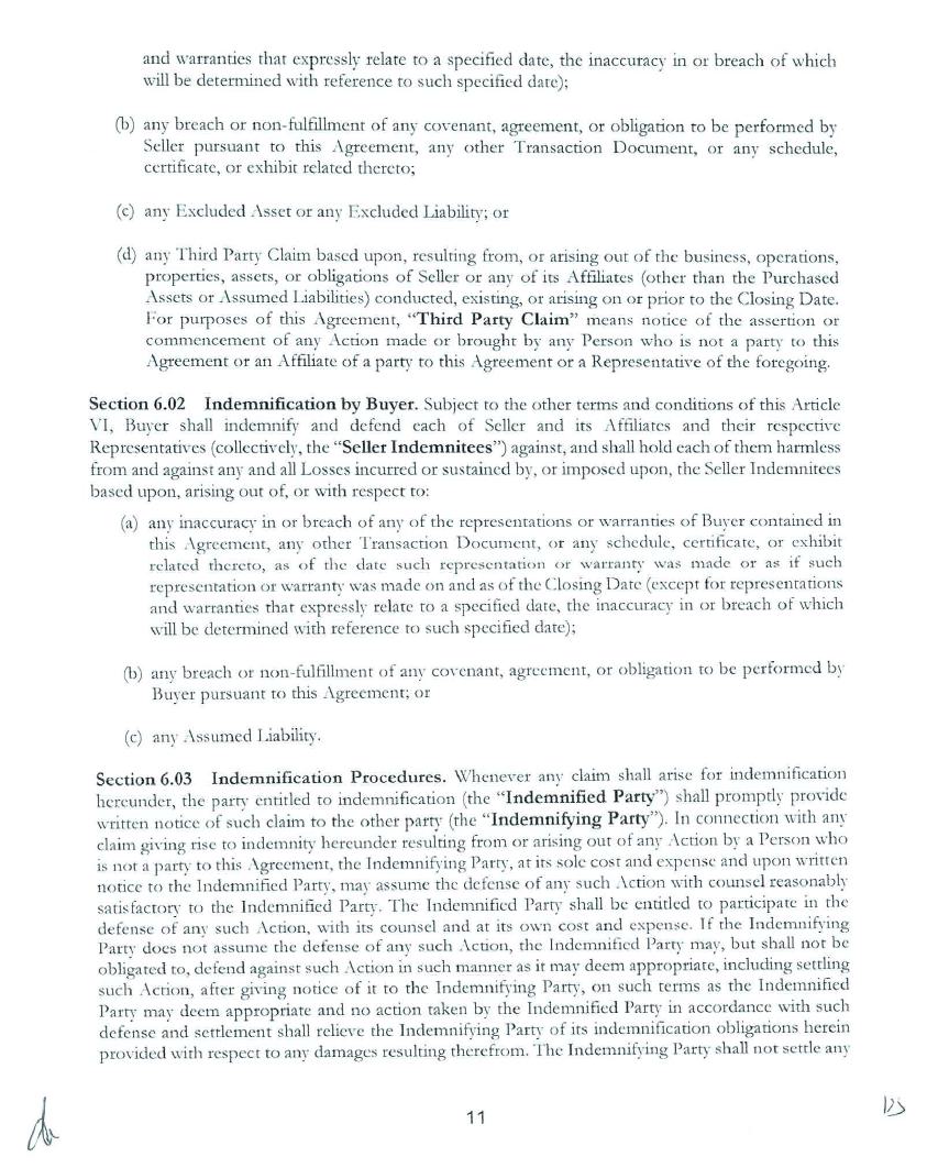 and ,,·arranties that expressly relate to a spec ified <late, the inaccuracy in or breach of which 11 ,,·ill be determined ,,·ith reference ro such s pe cified da t e); · (b) ny breach or n o n - fulfillmcnr of any coYenant, agreeme nt , or obligacion to be pcrfom 1 ed by Sel l r pur sua nt r _o . rh 1 s , \ grcemcnt, any other T ran saction Document, o r any schedule, certtficatc, or exh 1 h 1 t related thereto ; (c) any xclu ded . \ sset or any Excluded Liability; or (d) any Thi r d P arry C l aim ba:;cd upon, resulring from, or arising out of rhe business, operations, properties, assets, or obligatio n s of Se ll er or any of irs Affiliates (othe r than the Pur c ha sed • ssets or : \ ssumed ( - iab ilirie s) conducted, existing, or ar i sing on or prior to the Clos i ng Date. ! ·o r purposes of tlu s 1 \ grecmenr, " Third Party Claim " m ean notice of the assertion or commencement of any . \ cti o n made or brought by any Per son who i s not a part y to thi s Agreement or an Af filiat e of a part y to thi s Agreement or a R epresentatiYe of the fo egoing . Section 6 . 02 Indemnification by Buyer . Subjec t ro th e otl 1 er te rm s and conditions of this . \ niclc \ · 1 , Buyer shall indemnify and de fend each of Se ll er and irs 1 \ ffiliares and their respecti, · e Repre sentatives ( collcctiYcly, the " Seller Indemnitees ") against, and s h all hold eac h of them harmle ss from and agaimt any and all Losses incurred or sustained by, or imposed upon, th e Seller lnd emnirees based up o n, arisi n g out of, or with respect ro : ( a ) any inaccuracy in o r breach of a n y of the representations or warranties of Bu,·er contai n ed in this . \ greement, a n y other Transaction Document, or any schedule, ccrtificarc , o r e xhib ir n .: latc : d thereto, a : s of rhc date such rc : prcscntarjon or ,varranr - wa : s m . adc or a : - - if such representation or warranry was made on and as of rhe Closing Dare ( except for representations and ,varranties thar expre % l · rdate to a specified <late, the inaccuracy in or breach of ,vhich ,, · ill be determined with reference to s uch s p ecified date) ; 0> ) an y breach or non - fulfillment of any co, · enant, agreement, or obligation robe performed b Bu yer p ursua nt to chis . \ greemcnt ; or ( c ) any . \ s sumcd I .iabilicy. S ect ion 6 . 03 Indemnification Proc e dur es . Whene,·er any cl aim shall arise for indemnification hcrcumkr, the parry entitled to indemnification ( the " Ind e mnified Party " ) shall promptly prm·ide written not i ce of such claim to the other parry ( the " Indemnifying Party " ) . In co nne ction \ \ ith an · clnim gi, · i ng i - isc ro i ndemniry h ereunder resulting from or a ri sing our of any . \ crion by a Per s on ,vho is not a p arty ro this , \ grccmcnt, th e In demnifying Parr y , ar its sole cosr and expense .: a nd upon ,,Titren notice to the ln<lemnified Parry, may assume the defense of an - s uch . \ ctio , n , · ith counsel reasonably sati facrory ro the ]nd emnified Par ry . The 1 n<lemn _ ificd Parry s h a ll be entitled to participate in the defense of any such , \ ct . ion, wirh its cou n sel and at its own cost and expense . I f the In demnifying P arty docs n ot assume the d efense of any such . \ ctio n , the I ndemnified Parry may, bur s h a ll not be obl i garcd to, defend against such . \ ction i . n such manner as it may deem appropriacc, includin g settli n g such , \ ction, after giY in g notice of it to the Indemnifying Pa . rty, on such terms a s the Indemnified Party may deem nppropriate and no action taken by the Indemn ifie d P arry i . n accordance .: with such defense and settlement shall rclie, · e t h e I ndemnifying Part · o f its indcmnification obligations herein prO \ · idc<lwirh respect to any damages n .: sul t ing ther efrom . The Ind emnifying Party s h a ll not settle any