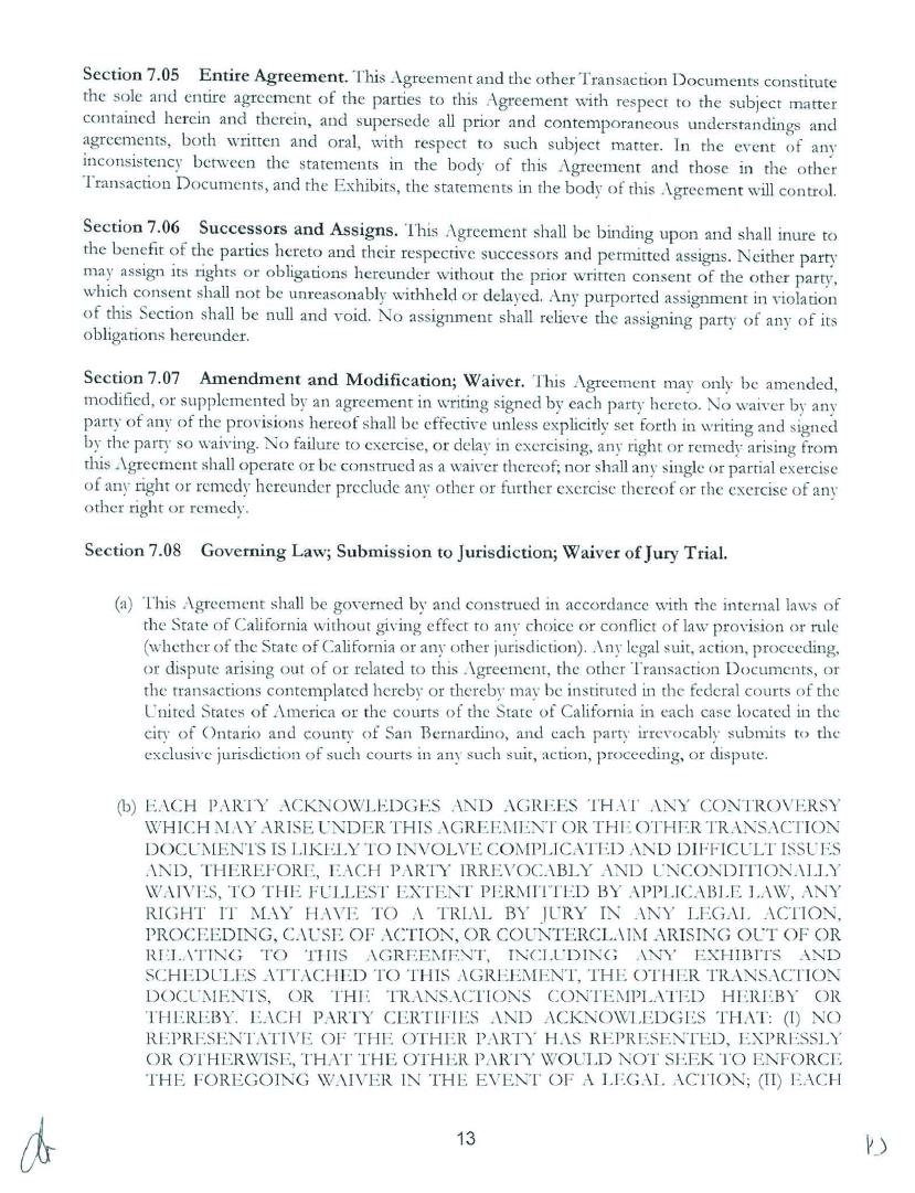 Se c ti o n 7 . 0 5 E ntir e Ag r e em e n t . This_ \ g re c m cnr and the oth er Transaction Document s constitute the so le and entire agreement of tl, e parties to chis : \ greement witl, r espect to t he subject matter contained herein and tl , erein, and s u pers ede all prior and contemporaneous unc . krstandin gs and agreements, both \ vritten a nd ora l, with r es p ect to s uch su bject matter . In the e, - enc of any inc o n s i s tenc y bern - cen tl 1 e sta t e ment s i n the b o d y of this . i \ grecmcnr and those i n the o th e r Tran sact ion D ocume nt s, and rht : Exhi bit s, the statements in t h e body of this . \ grcc ment will contro l . S e c tion 7 . 06 S ucc e s s or s a nd As s igns . Thi s r \ gree menr s hall be binding up o n and shall inure to thebe n efit of the parties hereto and their respective successo rs and p erm itted assigns . ' either parry may assign its rights or obligations h ere under withou t the prior written consenr of tl 1 c otl,er part y, ,vhich consent shall not b e unreasonably withheld or delayed . : \ n y purp o rted assignment in Yiolation of this Sectio n sha ll be nu ll and , - o id . Noassignment s hall relic \ ·e the ass igning part y of any of it s o bligations hereunder . Se c ti o n 7 . 07 Am e ndm e nt a nd M o difi ca tion ; Wai v er . Th . i s . \ gr ccrn e m may o nly be amended, modified, o r s upplemented b · a n agreement in writing signed by eac h party h e r eto . ; o \ \ "ain, : r by any part y of any of the pro \ · i s i o ns hereof s ha ll be cffectiYe u n . lcs s ex p l icitly set form in ,, - riting and s i gne d by the parr y so wai,· - i . ng . c • o failure to exercise, or delay in exe rci s in g, any right or remedy ar i ing from thi s, \ greemenr sha lJ operate or be construed as a wai, ·cr thereof ; nor shalJ any s ingle or partial ex e rcise of any ri g ht o r r e med y h ereunder pr e clude any o ther or further exercise thereof o r rhc exercise of an · o th er ri g ht or remedy . S ec ti o n 7 . 0 8 G o v e rnin g Law ; Submi ss ion t o Juri s di c ti o n ; Wai ve r o f Jury Tri a l . (a) This . - \ grecm ent shall be go , ·ernc d by and co n str ued i .. n a ccor d ance with rh c int erna l law s of the S tar e of Califo rnia without gi,·ing eff ect t o a n - c h o ic e or co nflict of law pro, · ision or rule (w hether of the Stare o f Ca lifornia or any or h er jurisdiction ) . . \ nylegal suit, actio n , proceeding, o r dispute arising out of or related t o thi s . \ greemcm , t he o tl 1 er Tran sact . ion D ocume nt s, or the tran sact i o n s contemplated hereby or tlwr eby ma y be in stitute d in th e fed e ral co urt s of the L " nircd St ate s of . \ . mcric a or tJ 1 e courts of rhc Srace of California in each ca e locaccJ in the c in - of Ontario and county of Sa n Bernardin o, and each parr · i 1 - rc,·ocabh· submits t o die ex lusin : ju . risd . iction of s uch courts in any s u c h suit, : lc tio 11 , pro ceeding, or tlisputc . (b) J - :. \ CH P , \ R'l'Y . \ CK .! " \ lOW Ll DGE S . \ N D . \ GR l - : ES T H . \ T . \ '. \ '.Y CO>JTRO \ ' l ·'. RSY \ VH J C H ; - .. 1 . \ Y . - \ RlS E l"NDERTHI S . \ GREr ; - .. 11 : S : T OR T HI • : OTH ER TR . \ : \ "S . \ CTION DOCU,(E 1 TS 1 S Llh :. ELY TO l>JVOL VE COi \ I P LI C \ TED . \ ND DIFFTCLTI" ISSL " ES . \ ' . ' - iD, THEREFORE, E . V : H P . \ R T Y IRRE \ 'O C . \ BLY . \ ND l . ">JC : O>iDfTI 0 : ' - 1 . \ lJ . Y W . - \ I VFS, TO Tl I I • : FLT . LE S T EXTEKT PERi \ IlTfL · J) 13 Y . · \ PPLJC : \ BLE L \ W, . - \ : ' - JY RIGH T IT i \ L \ Y H . \ \ T . TO . \ TR I . \ J .. BY JL"l Y I . \ NY LE( ; _ . \ J, : \ CT 10 , PROCL L DING , C . \ C S E OF . \ CTIOK, OR COL . N TERCL . \ Evf . - \ RISIN( ; OL"T OF OR RI - J . . \ Tl N( ; TO Tl 11 S , \ G RI · : E? - . W T . T - : - ,,i C LL"DlNC . \ ? - : Y l XHII 3 TTS . \ D SC HU)L'L l •: S . \ Tf . \ CI !ED TO T H I S . \ GREEl \ Ir - : NT, THI OTHER TR . - \ : - J S . \ CT I ON DOC : L " 0 IE : - J T S, OR THE 1 ll .. \ i S . \ CT IOi \ S CON T U ' 1 PL . \ TED HFRFBY OR THFREBY . E . \ CH P . \ RTY CERTlFJES . \ l \ : D . \ CKN 0 \ ' \ , 1 ,E DGES TH . \ T : ( I ) NO RLPR l •: S l - : : \ !T . \ Tl \ ' 1 :: oi : THE OTHER P . \ RTY H . \ S R . 1 - J>JU : S I · : N"rE D , LXPRLSSLY 13 OR OTHERW I SE, Tl··L \ T THE OTHER P . \ RTY \ VOL'L D "t \ O T Sl - '.E K TOE i fORCF THE FOREGOING W . \ I \ ' L R l N THE E \ . E"t \ T or . \ Ll C. - \ J. . · \ C TT ON; (TT ) F . - \ C:H