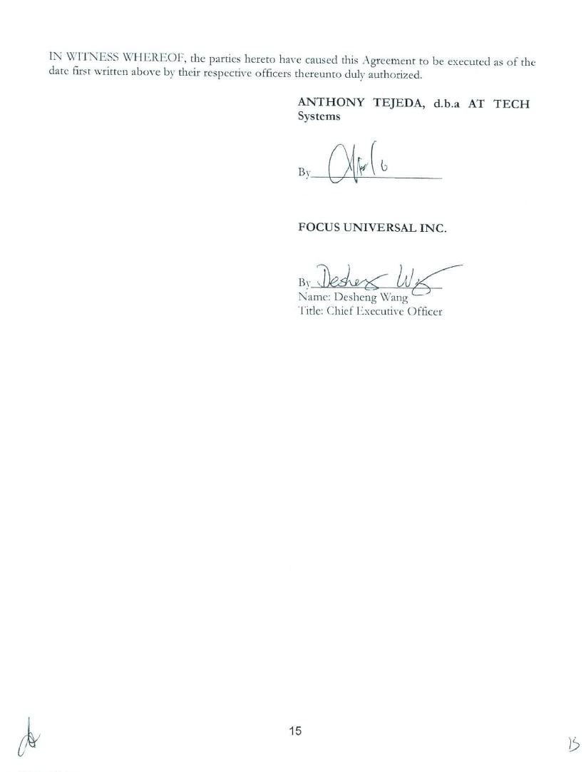 1 : - .i \ \ T E \ JES. \ ' 0 - - l fl{EOF, th e parties hereto hm·e caused th.is , \ grcemenr t o be execu t ed as of t h e: dare fir s t \ \ 'rittc n abm·e by their rcspecti,·c officers thereunto duly authorized. ANTHONY TE J EDA, d.b.a AT TECH S ys tem s FO C US U NIVERSAL IN C. B) ' uJ? 15 amc: Dcsheng \ X ' ang Tide: C h ief Exccutin : Officer