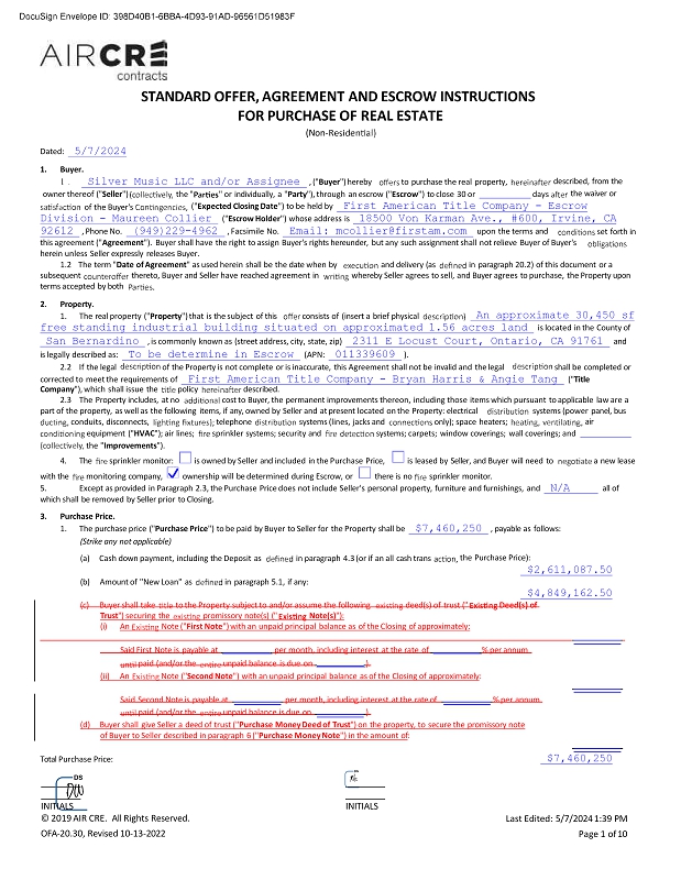 STANDARD OFFER, AGREEMENT AND ESCROW INSTRUCTIONS FOR PURCHASE OF REAL ESTATE (Non - Dated: 5/7/2024 1. Buyer. 1. Silver Music LLC and/or Assignee , (" Buyer ") hereby to purchase the real property, the " " or individually, a " Party "), through an escrow (" Escrow ") to close 30 or days described, from the the waiver or owner thereof (" Seller ") of the Buyer's (" Expected Closing Date ") to be held by First American Title Company - Escrow Division - Maureen Collier (" Escrow Holder ") whose address is 18500 Von Karman Ave., #600, Irvine, CA set forth in 92612 , Phone No. (949)229 - 4962 , Facsimile No. Email: mcollier@firstam.com upon the terms and this agreement (" Agreement "). Buyer shall have the right to assign Buyer's rights hereunder, but any such assignment shall not relieve Buyer of Buyer's herein unless Seller expressly releases Buyer. 1.2 The term " Date of Agreement " as used herein shall be the date when by and delivery (as in paragraph 20.2) of this document or a subsequent thereto, Buyer and Seller have reached agreement in whereby Seller agrees to sell, and Buyer agrees to purchase, the Property upon terms accepted by both 2. Property. 1. The real property (" Property ") that is the subject of this consists of (insert a brief physical An approximate 30,450 sf free standing industrial building situated on approximated 1.56 acres land is located in the County of San Bernardino , is commonly known as (street address, city, state, zip) 2311 E Locust Court, Ontario, CA 91761 and is legally described as: To be determine in Escrow (APN: 011339609 ). 2.2 If the legal of the Property is not complete or is inaccurate, this Agreement shall not be invalid and the legal shall be completed or corrected to meet the requirements of First American Title Company - Bryan Harris & Angie Tang (" Title Company "), which shall issue the policy 2.3 The Property includes, at no described. cost to Buyer, the permanent improvements thereon, including those items which pursuant to applicable law are a part of the property, as well as the following items, if any, owned by Seller and at present located on the Property: electrical telephone systems (lines, jacks and only); space heaters; systems (power panel, bus air sprinkler systems; security and systems; carpets; window coverings; wall coverings; and conduits, disconnects, equipment (" HVAC "); air lines; the " Improvements "). 4. The sprinkler monitor: is owned by Seller and included in the Purchase Price, is leased by Seller, and Buyer will need to a new lease with the monitoring company, ownership will be determined during Escrow, or there is no sprinkler monitor. 5. Except as provided in Paragraph 2.3, the Purchase Price does not include Seller's personal property, furniture and furnishings, and N/A all of which shall be removed by Seller prior to Closing. 3. Purchase Price. 1. The purchase price (" Purchase Price ") to be paid by Buyer to Seller for the Property shall be $7,460,250 , payable as follows: (Strike any not applicable) the Purchase Price): $2,611,087.50 $4,849,162.50 (a) Cash down payment, including the Deposit as in paragraph 4.3 (or if an all cash trans (b) Amount of "New Loan" as in paragraph 5.1, if any: Deed(s) of (c) Buyer shall take to the Property subject to and/or assume the following deed(s) of trust (" Trust ") securing the promissory note(s) (" Note(s) "): (i) An Note (" First Note ") with an unpaid principal balance as of the Closing of approximately: Said First Note is payable at per month, including interest at the rate of % per annum paid (and/or the unpaid balance is due on ). (ii) An Note (" Second Note ") with an unpaid principal balance as of the Closing of approximately : Said Second Note is payable at per month, including interest at the rate of % per annum paid (and/or the unpaid balance is due on ). (d) Buyer shall give Seller a deed of trust (" Purchase Money Deed of Trust ") on the property, to secure the promissory note of Buyer to Seller described in paragraph 6 (" Purchase Money Note ") in the amount of : Total Purchase Price: $7,460,250 INITIALS © 2019 AIR CRE. All Rights Reserved. OFA - 20.30, Revised 10 - 13 - 2022 INITIALS Last Edited: 5/7/2024 1:39 PM Page 1 of 10