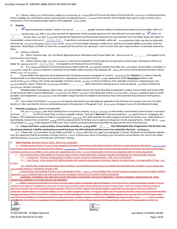 Deed of Trust and such deed of trust permits the to demand payment n to the transfer of the Property, Buyer agrees to pay such fees up to a 3.2 If Buyer is taking to the Property subject to, or assuming, an of fees including, but not limited to, points, processing fees, and appraisal fees as a maximum of 1.5% of the unpaid principal balance of the applicable Note. 4. Deposits. 1. Buyer has delivered to Broker a check in the sum of , payable to Escrow Holder, to be delivered by Broker to Escrow Holder within 2 or business days 5 business days both have executed this Agreement and the executed Agreement has been delivered to Escrow Holder, or within 2 or both have executed this Agreement and the executed Agreement has been delivered to Escrow Holder Buyer shall deliver to Escrow Holder a check in the sum of $100,000 . If said check is not received by Escrow Holder within said period then Seller may elect to unilaterally terminate this by giving of such to Escrow Holder whereupon neither Party shall have any further liability to the other under this Agreement. Should Buyer and Seller not enter into an agreement for purchase and sale, Buyer's check or funds shall, upon request by Buyer, be promptly returned to Buyer. 4.2 deposits: (a) Within 5 business days the Date of Agreement, Buyer shall deposit with Escrow Holder the sum of to be applied to the Purchase Price at the Closing. (b) Within 5 business days the discussed in paragraph 9.1 (a) through (m) are approved or waived, Buyer shall deposit with Escrow Holder the sum of $100,000 to be applied to the Purchase Price at the Closing. Deposit is not received by Escrow Holder within the period provided then Seller may Buyer, Escrow Holder, and Brokers, in Deposit is received by Escrow Holder within 2 business days following said the Escrow shall be deemed terminated without (c) If an that, unless the further or 3. Escrow Holder shall deposit the funds deposited with it by Buyer pursuant to paragraphs 4.1 and 4.2 the " Deposit "), in a State or Federally chartered bank in an interest bearing account whose term is appropriate and consistent with the ng requirements of this The interest therefrom shall accrue to the of Buyer, who hereby acknowledges that there may be or interest forfeitures if the applicable instrument is redeemed prior to its maturity. Buyer's Federal Tax Number is . NOTE: Such interest bearing account cannot be opened Buyer's Federal Tax Number is provided. 4. Notwithstanding the foregoing, within 5 days Escrow Holder receives the monies described in paragraph 4.1 above, Escrow Holder shall release $100 of said monies to Seller as and for independent for Seller's' of this Agreement and the of the period to Buyer as herein is non - refundable to Buyer but shall be credited to the Purchase Price in the event that the purchase of the Property is provided. Such independent completed. 4.5 Upon waiver of all of Buyer's the Deposit shall become non - refundable but applicable to the Purchase Price except in the event of a Seller breach, or in the event that the Escrow is terminated pursuant to the provisions of Paragraph 9.1(n) Damage or Loss) or 9.1(o) (Material Change). 5. Financing (Strike if not applicable) 1. This is upon Buyer obtaining from an insurance company, or other lender, a commitment to lend to Buyer a sum equal to at least 65 % of the Purchase Price, on terms acceptable to Buyer. Such loan (" New Loan ") shall be secured by a deed of trust or mortgage on the Property. If this Agreement provides for Seller to carry back junior then Seller shall have the right to approve the terms of the New Loan. Seller shall have 7 days following receipt of the commitment forth the proposed terms of the New Loan to approve or disapprove of such proposed terms. If Seller fails to Escrow Holder, in of the disapproval within said 7 days it shall be conclusively presumed that Seller has approved the terms of the New Loan. 5.2 If Buyer shall fail to its Broker, Escrow Holder and Seller, in within 30 days following the Date of Agreement, that the New Loan has not been obtained, it shall be conclusively presumed that Buyer has either obtained said New Loan or has waived this New Loan within the speci in paragraph 5.2 hereof, that Buyer has not obtained said New to the prompt return of the Deposit, plus any interest earned thereon, less only Escrow Holder 5.3 If Buyer shall its Broker, Escrow Holder and Seller, in Loan, this Agreement shall be terminated, and Buyer shall be and Title Company fees and costs, which Buyer shall pay. 6. Seller Financing. (Purchase Money Note). (Strike if not applicable) 1. If Seller approves Buyer's (see paragraph 6.5) the Purchase Money Note shall provide for interest on unpaid principal at the rate of % per annum, with principal and interest paid as follows: . The Purchase Money Note and Purchase Money Deed of Trust shall be on the current forms commonly used by Escrow Holder, and be junior and subordinate only to the Note(s) and/or the New Loan expressly called for by this Agreement . 2. The Purchase Money Note and/or the Purchase Money Deed of Trust shall contain provisions regarding the following (see also paragraph 10.3 (b)): (a) Prepayment . Principal may be prepaid in whole or in part at any without penalty, at the of the Buyer. (b) Late Charge . A late charge of 6% shall be payable with respect to any payment of principal, interest, or other charges, not made within 10 days it is due . (c) Due On Sale . In the event the Buyer sells or transfers to the Property or any thereof, then the Seller may, at Seller's require the unpaid balance of said Note to be paid in full. 3. If the Purchase Money Deed of Trust is to be subordinate to other Escrow Holder shall, at Buyer's expense prepare and record on Seller's behalf a request for of default and/or sale with regard to each mortgage or deed of trust to which it will be subordinate . 4. WARNING: CALIFORNIA LAW DOES NOT ALLOW DEFICIENCY JUDGEMENTS ON SELLER FINAN