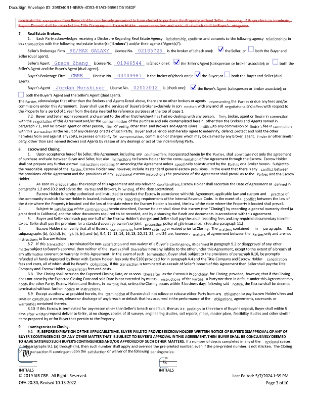 . If Buyer elects to terminate, terminate this then Buyer shall be conclusively presumed to have elected to purchase the Property without Seller Buyer's Deposit shall be refunded less Title Company and Escrow Holder fees and costs, all of which shall be Buyer's . 7. Real Estate Brokers. 1. Each Party acknowledges receiving a Disclosure Regarding Real Estate Agency rms and consents to the following agency in this with the following real estate broker(s) (" Brokers ") and/or their agents (“Agent(s)”): Seller's Brokerage Firm RE/MAX GALAXY License No. 02185725 is the broker of (check one): the Seller; or both the Buyer and Seller (dual agent). Seller's Agent Grace Zhang License No. 01946544 is (check one): Seller's Agent and the Buyer's Agent (dual agent). the Seller's Agent (salesperson or broker associate); or both the Buyer's Brokerage Firm CBRE License No. 00409987 is the broker of (check one): the Buyer; or both the Buyer and Seller (dual agent). the Buyer's Agent (salesperson or broker associate); or The Buyer's Agent Jordan Hershiser License No. 02053012 is (check one): both the Buyer's Agent and the Seller's Agent (dual agent). acknowledge that other than the Brokers and Agents listed above, there are no other brokers or agents the or due any fees and/or and with respect to commissions under this Agreement. Buyer shall use the services of Buyer's Broker exclusively in con with any and all the Property for a period of 1 year from the date inserted for reference purposes at the top of page 1. 7.2 Buyer and Seller each represent and warrant to the other that he/she/it has had no dealings with any person, broker, agent or in with the of this Agreement and/or the of the purchase and sale contemplated herein, other than the Brokers and Agents named in paragraph 7.1, and no broker, agent or other person, or other than said Brokers and Agents is/are to any commission or fee in with this as the result of any dealings or acts of such Party. Buyer and Seller do each hereby agree to indemnify, defend, protect and hold the other harmless from and against any costs, expenses or liability for commission or charges which may be claimed by any broker, agent, or other similar party, other than said named Brokers and Agents by reason of any dealings or act of the indemnifying Party. 8. Escrow and Closing. 1. Upon acceptance hereof by Seller, this Agreement, including any incorporated herein by the shall not only the agreement of purchase and sale between Buyer and Seller, but also shall not prepare any further escrow to Escrow Holder for the consu of the Agreement through the Escrow. Escrow Holder or amending the Agreement unless cally so instructed by the or a Broker herein. Subject to between and the Escrow the reasonable approval of the Escrow Holder may, however, include its standard general escrow provisions. In the event that there is any the provisions of the Agreement and the provisions of any escrow the provisions of the Agreement shall prevail as to the Holder. 2. As soon as the receipt of this Agreement and any relevant Escrow Holder shall ascertain the Date of Agreement as in paragraphs 1 . 2 and 20 . 2 and advise the and Brokers, in of the date ascertained . 3. Escrow Holder is hereby authorized and instructed to conduct the Escrow in accordance with this Agreement, applicable law and custom and of the community in which Escrow Holder is located, including any requirements of the Internal Revenue Code . In the event of a between the law of the state where the Property is located and the law of the state where the Escrow Holder is located, the law of the state where the Property is located shall prevail . 4. Subject to of the herein described, Escrow Holder shall close this escrow (the " Closing ") by recording a general warranty deed (a grant deed in California) and the other documents required to be recorded, and by disbursing the funds and documents in accordance with this Agreement . 5. Buyer and Seller shall each pay one - half of the Escrow Holder's charges and Seller shall pay the usual recording fees and any required documentary transfer taxes . Seller shall pay the premium for a standard coverage owner's or joint policy of tle insurance . (See also paragraph 11 . ) 6. Escrow Holder shall verify that all of Buyer's have been or waived prior to Closing . The contained in paragraphs 9 . 1 subparagraphs (b), (c), (d), (e), (g), (i), (n), and (o), 9 . 4 , 12 , 13 , 14 , 16 , 18 , 20 , 21 , 22 , and 24 are, however, of agreement between the only and are not to Escrow Holder . as in paragraph 9.2 or disapproval of any other 8.7 If this is terminated for non - and non - waiver of a Buyer's subject to Buyer's approval, then neither of the shall any covenant or warranty in this Agreement. In the event of such have any liability to the other under this Agreement, except to the extent of a breach of Buyer shall, subject to the provisions of paragraph 8.10, be promptly refunded all funds deposited by Buyer with Escrow Holder, less only the $100 provided for in paragraph 4.4 and the Title Company and Escrow Holder fees and costs, all of which shall be Buyer's If this is terminated as a result of Seller's breach of this Agreement then Seller shall pay the Title Company and Escrow Holder fees and costs. 8.8 The Closing shall occur on the Expected Closing Date, or as soon does not occur by the Expected Closing Date and said Date is not extended by mutual as the Escrow is in of the for Closing; provided, however, that if the Closing a Party not then in default under this Agreement may the other Party, Escrow Holder, and Brokers, in that, unless the Closing occurs within 5 business days following said the Escrow shall be deemed terminated without further or 8.9 Except as otherwise provided herein, the of Escrow shall not relieve or release either Party from any costs or to pay Escrow Holder's fees and agreements, covenants or a waiver, release or discharge of any breach or default that has occur