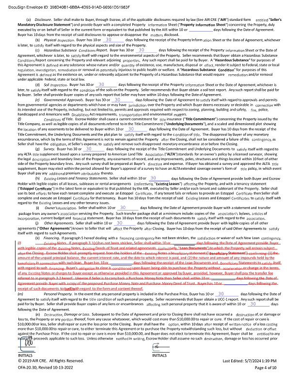 (a) Disclosure . Seller shall make to Buyer, through Escrow, all of the applicable disclosures required by law (See AIR CRE (" AIR ") standard form " Seller's Mandatory Disclosure Statement ") and provide Buyer with a completed Property Sheet (" Property Sheet ") concerning the Property, duly executed by or on behalf of Seller in the current form or equivalent to that published by the AIR within 10 or days following the Date of Agreement. Buyer has 10 days from the receipt of said disclosures to approve or disapprove the disclosed. (b) Physical . Buyer has 10 or 30 days following the receipt of the Property Inform Sheet or the Date of Agreement, whichever is later, to itself with regard to the physical aspects and size of the Property. Report . Buyer has 30 or 30 days following the receipt of the Property Sheet or the Date of (c) Hazardous Substance Agreement, whichever is later, to itself with regard to the environmental aspects of the Property. Seller recommends that Buyer obtain a Hazardous Substance Report concerning the Property and relevant adjoining this Agreement is as any substance whose nature and/or Any such report shall be paid for by Buyer. A " Hazardous Substance " for purposes of of existence, use, manufacture, disposal or render it subject to Federal, state or local Agreement is or removal as injurious to public health or welfare. A " Hazardous Substance as the existence on, under or relevantly adjacent to the Property of a Hazardous Substance that would require " for purposes of this and/or removal under applicable Federal, state or local law. (d) Soil . Buyer has 30 or 30 days following the receipt of the Property n Sheet or the Date of Agreement, whichever is later, to itself with regard to the of the soils on the Property. Seller recommends that Buyer obtain a soil test report. Any such report shall be paid for by Buyer. Seller shall provide Buyer copies of any soils report that Seller may have within 10 days following the Date of Agreement. (e) Governmental Approvals . Buyer has 30 or 30 days following the Date of Agreement to y itself with regard to approvals and permits from governmental agencies or departments which have or may have over the Property and which Buyer deems necessary or desirable in with its intended use of the Property, including, but not limited to, permits and approvals required with respect to zoning, planning, building and safety, police, handicapped and Americans with Act requirements, and environmental ers. (f) of Title . Escrow Holder shall cause a current commitment for insurance (" Title Commitment ") concerning the Property issued by the Title Company, as well as legible copies of all documents referred to in the Title Commitment (" Underlying Documents "), and a scaled and dimensioned plot showing the of any easements to be delivered to Buyer within 10 or 30 days following the Date of Agreement. Buyer has 10 days from the receipt of the Title Commitment, the Underlying Documents and the plot plan to itself with regard to the c of The disapproval by Buyer of any monetary encumbrance, which by the terms of this Agreement is not to remain against the Property the Closing, shall not be considered a failure of this as Seller shall have the at Seller's expense, to and remove such disapproved monetary encumbrance at or before the Closing. (g) Survey . Buyer has 30 or 30 days following the receipt of the Title Commitment and Underlying Documents to itself with regard to any ALTA the legal supplement based upon a survey prepared to American Land Title (" ALTA ") standards for an owner's policy by a licensed surveyor, showing and boundary lines of the Property, any easements of record, and any improvements, poles, structures and things located within 10 feet of either side of the Property boundary lines. Any such survey shall be prepared at Buyer's and expense. If Buyer has obtained a survey and approved the ALTA supplement, Buyer may elect within the period allowed for Buyer's approval of a survey to have an ALTA extended coverage owner's form of policy, in which event Buyer shall pay any premium thereto. (h) Leases and Tenancy Statements . Seller shall within 10 or 30 days following the Date of Agreement provide both Buyer and Escrow Holder with legible copies of all leases, subleases or rental arrangements " g Leases ") the Property, and with a tenancy statement ") in the latest form or equivalent to that published by the AIR, executed by Seller and/or each tenant and subtenant of the Property. Seller shall (" Estoppel use its best to have each tenant complete and execute an Estoppel If any tenant fails or refuses to provide an Estoppel then Seller shall complete and execute an Estoppel for that tenancy. Buyer has 10 days from the receipt of said Leases and Estoppel to itself with regard to the Leases and any other tenancy issues. . Seller shall within 10 or 30 days following the Date of Agreement provide Buyer with a statement and transfer (i) Owner's package from any owner's servicing the Property. Such transfer package shall at a minimum include: copies of the bylaws, of current budget and statement. Buyer has 10 days from the receipt of such documents to itself with regard to the (j) Other Agreements . Seller shall within 10 or 30 days following the Date of Agreement provide Buyer with legible copies of all other agreements (" Other Agreements ") known to Seller that will the Property itself with regard to such Agreements. (k) Financing . If paragraph 5 hereof dealing with a Closing. Buyer has 10 days from the receipt of said Other Agreements to has not been stricken, the or waiver of such New Loan (l) Notes . If paragraph 3.1(c) has not been stricken, Seller shall within 10 or days following the Date of Agreement provide Buyer with legible copies of the Notes, Deeds of Trust and related agreements vely, " Loan Documents ") to which the Property will remain subject the Closing. Escrow Holder shall promptly request from the holders of the No