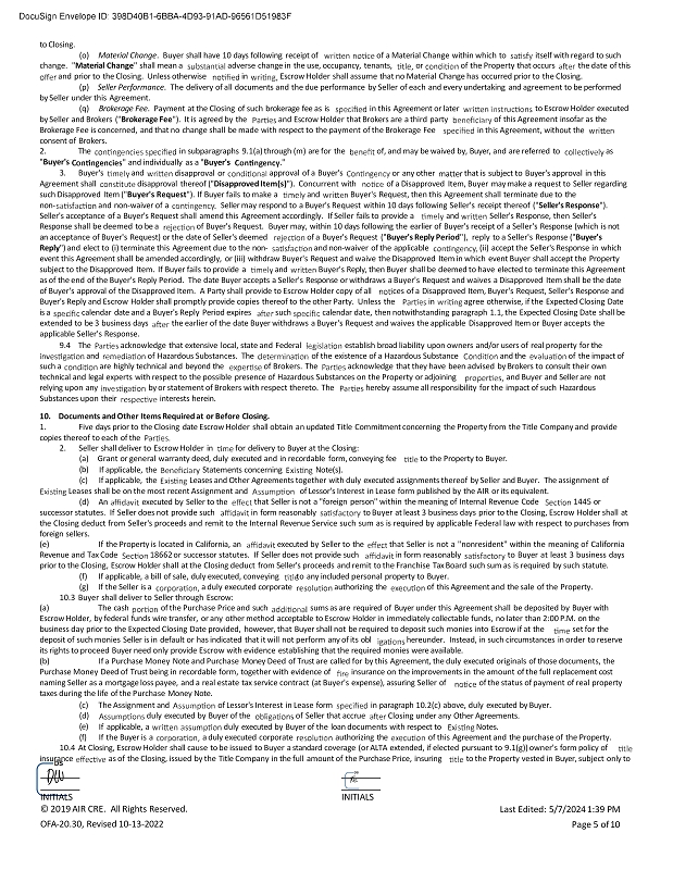 to Closing. (o) Material Change . Buyer shall have 10 days following receipt of of a Material Change within which to itself with regard to such change. " Material Change " shall mean a adverse change in the use, occupancy, tenants, or of the Property that occurs the date of this and prior to the Closing. Unless otherwise in Escrow Holder shall assume that no Material Change has occurred prior to the Closing. (p) Seller Performance . The delivery of all documents and the due performance by Seller of each and every undertaking and agreement to be performed by Seller under this Agreement. to Escrow Holder executed of this Agreement insofar as the in this Agreement, without the (q) Brokerage Fee . Payment at the Closing of such brokerage fee as is in this Agreement or later by Seller and Brokers (" Brokerage Fee "). It is agreed by the and Escrow Holder that Brokers are a third party Brokerage Fee is concerned, and that no change shall be made with respect to the payment of the Brokerage Fee consent of Brokers. " and individually as a " Buyer's 2. The in subparagraphs 9.1(a) through (m) are for the of, and may be waived by, Buyer, and are referred to as " Buyer's 3. Buyer's and disapproval or ." approval of a Buyer's or any other that is subject to Buyer's approval in this Agreement shall disapproval thereof (" Disapproved Item(s) "). Concurrent with of a Disapproved Item, Buyer may make a request to Seller regarding such Disapproved Item (" Buyer's Request "). If Buyer fails to make a and Buyer's Request, then this Agreement shall terminate due to the non - and non - waiver of a Seller may respond to a Buyer's Request within 10 days following Seller's receipt thereof (" Seller's Response "). Seller's acceptance of a Buyer's Request shall amend this Agreement accordingly. If Seller fails to provide a and Seller's Response, then Seller's Response shall be deemed to be a of Buyer's Request. Buyer may, within 10 days following the earlier of Buyer's receipt of a Seller's Response (which is not an acceptance of Buyer's Request) or the date of Seller's deemed of a Buyer's Request (" Buyer's Reply Period "), reply to a Seller's Response (" Buyer's Reply ") and elect to (i) terminate this Agreement due to the non - and non - waiver of the applicable (ii) accept the Seller's Response in which event this Agreement shall be amended accordingly, or (iii) withdraw Buyer's Request and waive the Disapproved Item in which event Buyer shall accept the Property subject to the Disapproved Item. If Buyer fails to provide a and Buyer's Reply, then Buyer shall be deemed to have elected to terminate this Agreement as of the end of the Buyer's Reply Period. The date Buyer accepts a Seller's Response or withdraws a Buyer's Request and waives a Disapproved Item shall be the date of Buyer's approval of the Disapproved Item. A Party shall provide to Escrow Holder copy of all ces of a Disapproved Item, Buyer's Request, Seller's Response and Buyer's Reply and Escrow Holder shall promptly provide copies thereof to the other Party. Unless the in agree otherwise, if the Expected Closing Date is a calendar date and a Buyer's Reply Period expires such calendar date, then notwithstanding paragraph 1.1, the Expected Closing Date shall be extended to be 3 business days the earlier of the date Buyer withdraws a Buyer's Request and waives the applicable Disapproved Item or Buyer accepts the applicable Seller's Response. 9.4 The and acknowledge that extensive local, state and Federal establish broad liability upon owners and/or users of real property for the of Hazardous Substances. The of the existence of a Hazardous Substance and the of the impact of such a are highly technical and beyond the of Brokers. The acknowledge that they have been advised by Brokers to consult their own technical and legal experts with respect to the possible presence of Hazardous Substances on the Property or adjoining and Buyer and Seller are not relying upon any Substances upon their by or statement of Brokers with respect thereto. The hereby assume all responsibility for the impact of such Hazardous interests herein. 10. Documents and Other Items Required at or Before Closing. 1. Five days prior to the Closing date Escrow Holder shall obtain an updated Title Commitment concerning the Property from the Title Company and provide copies thereof to each of the 2. Seller shall deliver to Escrow Holder in for delivery to Buyer at the Closing: Note(s). (a) Grant or general warranty deed, duly executed and in recordable form, conveying fee to the Property to Buyer. (b) (c) If applicable, the Statements concerning If applicable, the Leases and Other Agreements together with duly executed assignments thereof by Seller and Buyer. The assignment of Leases shall be on the most recent Assignment and of Lessor's Interest in Lease form published by the AIR or its equivalent. that Seller is not a "foreign person" within the meaning of Internal Revenue Code 1445 or (d) An executed by Seller to the successor statutes. If Seller does not provide such in form reasonably to Buyer at least 3 business days prior to the Closing, Escrow Holder shall at the Closing deduct from Seller's proceeds and remit to the Internal Revenue Service such sum as is required by applicable Federal law with respect to purchases from foreign sellers . (e) If the Property is located in California, an executed by Seller to the that Seller is not a ''nonresident" within the meaning of California Revenue and Tax Code 18662 or successor statutes . If Seller does not provide such in form reasonably to Buyer at least 3 business days prior to the Closing, Escrow Holder shall at the Closing deduct from Seller's proceeds and remit to the Franchise Tax Board such sum as is required by such statute . (f) If applicable, a bill of sale, duly executed, conveying to any included personal property to Buyer . (g) If the Seller is a a duly executed corporate authorizing the of this Agreement and the sale of the P