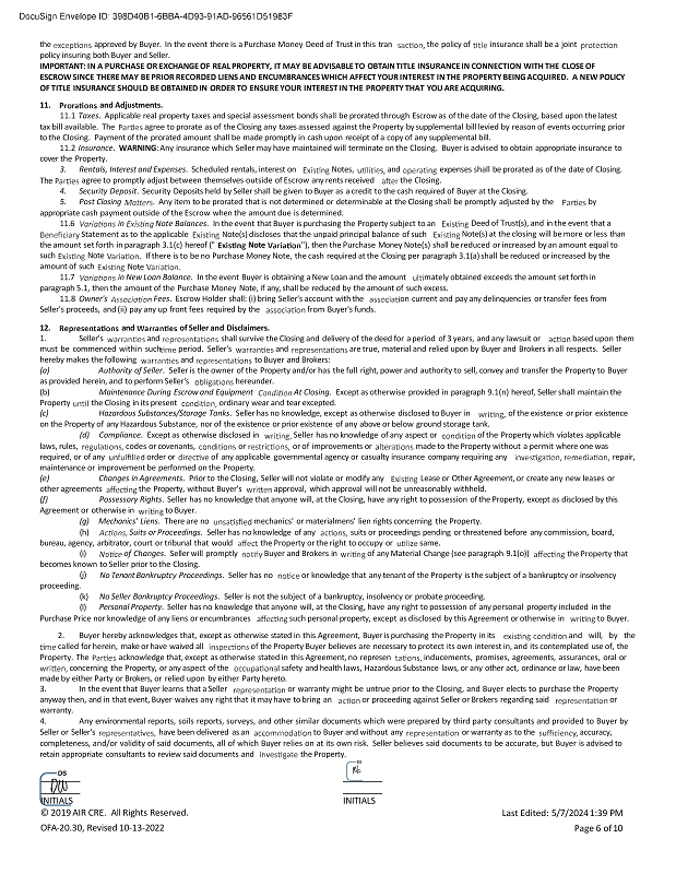 the approved by Buyer. In the event there is a Purchase Money Deed of Trust in this tran the policy of insurance shall be a joint policy insuring both Buyer and Seller. IMPORTANT: IN A PURCHASE OR EXCHANGE OF REAL PROPERTY, IT MAY BE ADVISABLE TO OBTAIN TITLE INSURANCE IN CONNECTION WITH THE CLOSE OF ESCROW SINCE THERE MAY BE PRIOR RECORDED LIENS AND ENCUMBRANCES WHICH AFFECT YOUR INTEREST IN THE PROPERTY BEING ACQUIRED. A NEW POLICY OF TITLE INSURANCE SHOULD BE OBTAINED IN ORDER TO ENSURE YOUR INTEREST IN THE PROPERTY THAT YOU ARE ACQUIRING. 11. and Adjustments. 11.1 Taxes . Applicable real property taxes and special assessment bonds shall be prorated through Escrow as of the date of the Closing, based upon the latest tax bill available. The agree to prorate as of the Closing any taxes assessed against the Property by supplemental bill levied by reason of events occurring prior to the Closing. Payment of the prorated amount shall be made promptly in cash upon receipt of a copy of any supplemental bill. 11.2 Insurance . WARNING : Any insurance which Seller may have maintained will terminate on the Closing. Buyer is advised to obtain appropriate insurance to cover the Property. The 3. Rentals, Interest and Expenses . Scheduled rentals, interest on Notes, and expenses shall be prorated as of the date of Closing. agree to promptly adjust between themselves outside of Escrow any rents received the Closing. 4. Security Deposit . Security Deposits held by Seller shall be given to Buyer as a credit to the cash required of Buyer at the Closing. 5. Post Closing . Any item to be prorated that is not determined or determinable at the Closing shall be promptly adjusted by the by appropriate cash payment outside of the Escrow when the amount due is determined. 11.6 in Note Balances . In the event that Buyer is purchasing the Property subject to an Deed of Trust(s), and in the event that a Note(s) at the closing will be more or less than Statement as to the applicable Note(s) discloses that the unpaid principal balance of such the amount set forth in paragraph 3.1(c) hereof (" Note "), then the Purchase Money Note(s) shall be reduced or increased by an amount equal to If there is to be no Purchase Money Note, the cash required at the Closing per paragraph 3.1(a) shall be reduced or increased by the such Note amount of such 11.7 Note in New Loan Balance . In the event Buyer is obtaining a New Loan and the amount mately obtained exceeds the amount set forth in paragraph 5.1, then the amount of the Purchase Money Note, if any, shall be reduced by the amount of such excess. 11.8 Owner's Fees . Escrow Holder shall: (i) bring Seller's account with the on current and pay any delinquencies or transfer fees from Seller's proceeds, and (ii) pay any up front fees required by the from Buyer's funds. of Seller and Disclaimers. shall survive the Closing and delivery of the deed for a period of 3 years, and any lawsuit or based upon them 12. and 1. Seller's and must be commenced within such hereby makes the following period. Seller's and and are true, material and relied upon by Buyer and Brokers in all respects. Seller to Buyer and Brokers: (a) Authority of Seller . Seller is the owner of the Property and/or has the full right, power and authority to sell, convey and transfer the Property to Buyer as provided herein, and to perform Seller's hereunder. (b) Maintenance During Escrow and Equipment At Closing . Except as otherwise provided in paragraph 9.1(n) hereof, Seller shall maintain the Property the Closing in its present ordinary wear and tear excepted. (c) Hazardous Substances/Storage Tanks . Seller has no knowledge, except as otherwise disclosed to Buyer in of the existence or prior existence on the Property of any Hazardous Substance, nor of the existence or prior existence of any above or below ground storage tank. (d) Compliance . Except as otherwise disclosed in Seller has no knowledge of any aspect or of the Property which violates applicable or of improvements or made to the Property without a permit where one was laws, rules, required, or of any codes or covenants, or order or of any applicable governmental agency or casualty insurance company requiring any repair, maintenance or improvement be performed on the Property. (e) Changes in Agreements . Prior to the Closing, Seller will not violate or modify any Lease or Other Agreement, or create any new leases or other agreements the Property, without Buyer's approval, which approval will not be unreasonably withheld. (f) Possessory Rights . Seller has no knowledge that anyone will, at the Closing, have any right to possession of the Property, except as disclosed by this Agreement or otherwise in to Buyer. (g) Mechanics' Liens . There are no mechanics' or materialmens' lien rights concerning the Property. (h) Suits or Proceedings . Seller has no knowledge of any suits or proceedings pending or threatened before any commission, board, bureau, agency, arbitrator, court or tribunal that would the Property or the right to occupy or same. (i) of Changes . Seller will promptly Buyer and Brokers in of any Material Change (see paragraph 9.1(o)) becomes known to Seller prior to the Closing. the Property that (j) proceeding. (k) (l) No Tenant Bankruptcy Proceedings . Seller has no or knowledge that any tenant of the Property is the subject of a bankruptcy or insolvency No Seller Bankruptcy Proceedings . Seller is not the subject of a bankruptcy, insolvency or probate proceeding. Personal Property . Seller has no knowledge that anyone will, at the Closing, have any right to possession of any personal property included in the Purchase Price nor knowledge of any liens or encumbrances such personal property, except as disclosed by this Agreement or otherwise in to Buyer . 2. Buyer hereby acknowledges that, except as otherwise stated in this Agreement, Buyer is purchasing the Property in its and will, by the called for herein, make or have waived all of the Property Buye