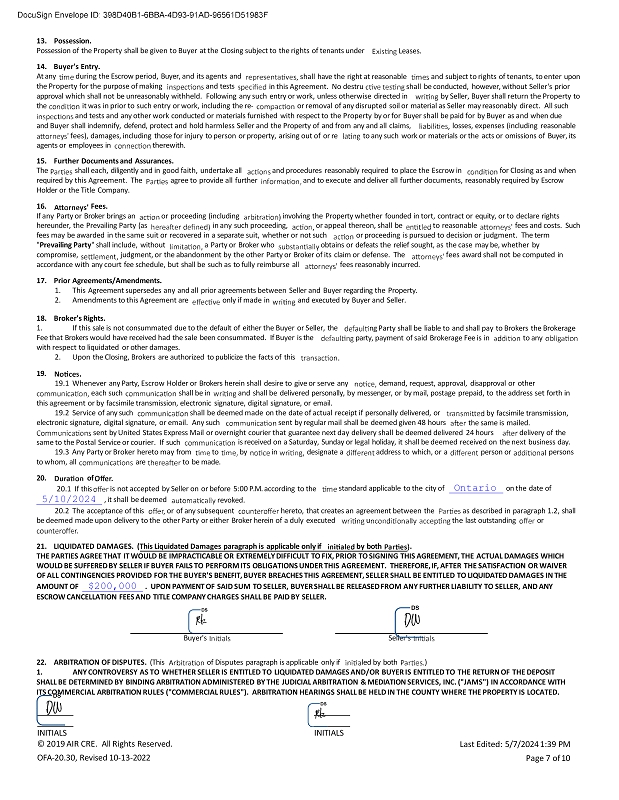 13. Possession. Possession of the Property shall be given to Buyer at the Closing subject to the rights of tenants under Leases. shall have the right at reasonable and subject to rights of tenants, to enter upon 14. Buyer's Entry. At any during the Escrow period, Buyer, and its agents and the Property for the purpose of making and tests in this Agreement. No destru shall be conducted, however, without Seller's prior approval which shall not be unreasonably withheld. Following any such entry or work, unless otherwise directed in by Seller, Buyer shall return the Property to the it was in prior to such entry or work, including the re - or removal of any disrupted soil or material as Seller may reasonably direct. All such and tests and any other work conducted or materials furnished with respect to the Property by or for Buyer shall be paid for by Buyer as and when due and Buyer shall indemnify, defend, protect and hold harmless Seller and the Property of and from any and all claims, losses, expenses (including reasonable fees), damages, including those for injury to person or property, arising out of or re to any such work or materials or the acts or omissions of Buyer, its agents or employees in therewith. 15. Further Documents and Assurances. The shall each, diligently and in good faith, undertake all and procedures reasonably required to place the Escrow in for Closing as and when required by this Agreement. The agree to provide all further and to execute and deliver all further documents, reasonably required by Escrow Holder or the Title Company. 16. Fees. If any Party or Broker brings an or proceeding (including involving the Property whether founded in tort, contract or equity, or to declare rights hereunder, the Prevailing Party (as in any such proceeding, or appeal thereon, shall be to reasonable fees and costs. Such fees may be awarded in the same suit or recovered in a separate suit, whether or not such or proceeding is pursued to decision or judgment. The term " Prevailing Party " shall include, without a Party or Broker who obtains or defeats the relief sought, as the case may be, whether by compromise, judgment, or the abandonment by the other Party or Broker of its claim or defense. The fees award shall not be computed in accordance with any court fee schedule, but shall be such as to fully reimburse all fees reasonably incurred. 17. Prior Agreements/Amendments. 1. This Agreement supersedes any and all prior agreements between Seller and Buyer regarding the Property. 2. Amendments to this Agreement are only if made in and executed by Buyer and Seller. ng Party shall be liable to and shall pay to Brokers the Brokerage party, payment of said Brokerage Fee is in to any 18. Broker's Rights. 1. If this sale is not consummated due to the default of either the Buyer or Seller, the Fee that Brokers would have received had the sale been consummated. If Buyer is the with respect to liquidated or other damages. 2. Upon the Closing, Brokers are authorized to publicize the facts of this 19. 19.1 Whenever any Party, Escrow Holder or Brokers herein shall desire to give or serve any demand, request, approval, disapproval or other each such shall be in and shall be delivered personally, by messenger, or by mail, postage prepaid, to the address set forth in this agreement or by facsimile transmission, electronic signature, digital signature, or email. 19.2 Service of any such shall be deemed made on the date of actual receipt if personally delivered, or electronic signature, digital signature, or email. Any such sent by regular mail shall be deemed given 48 hours by facsimile transmission, the same is mailed. sent by United States Express Mail or overnight courier that guarantee next day delivery shall be deemed delivered 24 hours delivery of the is received on a Saturday, Sunday or legal holiday, it shall be deemed received on the next business day. by in designate a address to which, or a person or persons same to the Postal Service or courier. If such 19.3 Any Party or Broker hereto may from to to whom, all are to be made. 20. of 20.1 If this is not accepted by Seller on or before 5:00 P.M. according to the standard applicable to the city of Ontario on the date of 5/10/2024 , it shall be deemed revoked. 20.2 The acceptance of this or of any subsequent hereto, that creates an agreement between the be deemed made upon delivery to the other Party or either Broker herein of a duly executed u as described in paragraph 1.2, shall the last outstanding or 21. LIQUIDATED DAMAGES. (This Liquidated Damages paragraph is applicable only if by both . THE PARTIES AGREE THAT IT WOULD BE IMPRACTICABLE OR EXTREMELY DIFFICULT TO FIX, PRIOR TO SIGNING THIS AGREEMENT, THE ACTUAL DAMAGES WHICH WOULD BE SUFFERED BY SELLER IF BUYER FAILS TO PERFORM ITS OBLIGATIONS UNDER THIS AGREEMENT. THEREFORE, IF, AFTER THE SATISFACTION OR WAIVER OF ALL CONTINGENCIES PROVIDED FOR THE BUYER'S BENEFIT, BUYER BREACHES THIS AGREEMENT, SELLER SHALL BE ENTITLED TO LIQUIDATED DAMAGES IN THE AMOUNT OF $200,000 . UPON PAYMENT OF SAID SUM TO SELLER, BUYER SHALL BE RELEASED FROM ANY FURTHER LIABILITY TO SELLER, AND ANY ESCROW CANCELLATION FEES AND TITLE COMPANY CHARGES SHALL BE PAID BY SELLER. Buyer's Seller's 22. ARBITRATION OF DISPUTES. (This of Disputes paragraph is applicable only if led by both ) 1. ANY CONTROVERSY AS TO WHETHER SELLER IS ENTITLED TO LIQUIDATED DAMAGES AND/OR BUYER IS ENTITLED TO THE RETURN OF THE DEPOSIT SHALL BE DETERMINED BY BINDING ARBITRATION ADMINISTERED BY THE JUDICIAL ARBITRATION & MEDIATION SERVICES, INC. ("JAMS") IN ACCORDANCE WITH ITS COMMERCIAL ARBITRATION RULES ("COMMERCIAL RULES"). ARBITRATION HEARINGS SHALL BE HELD IN THE COUNTY WHERE THE PROPERTY IS LOCATED. INITIALS © 2019 AIR CRE. All Rights Reserved. OFA - 20.30, Revised 10 - 13 - 2022 INITIALS Last Edited: 5/7/2024 1:39 PM Page 7 of 10