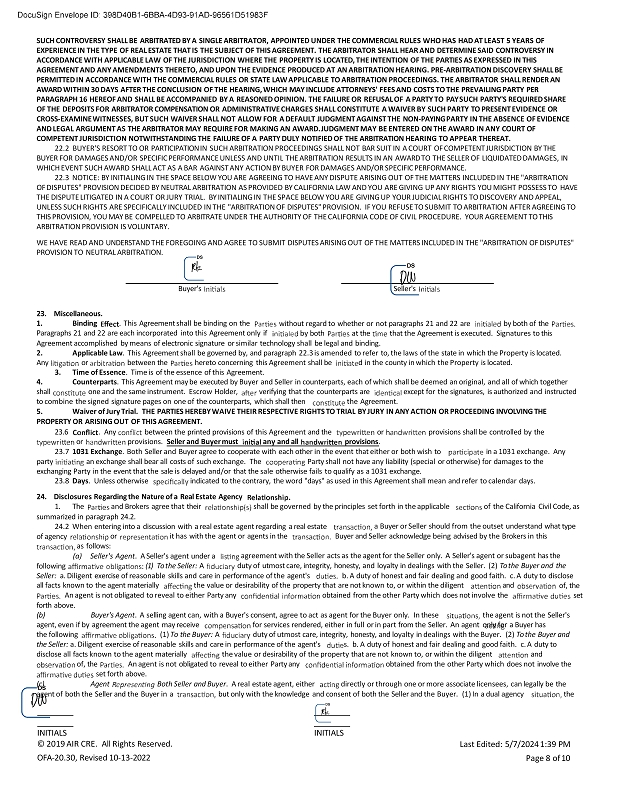 SUCH CONTROVERSY SHALL BE ARBITRATED BY A SINGLE ARBITRATOR, APPOINTED UNDER THE COMMERCIAL RULES WHO HAS HAD AT LEAST 5 YEARS OF EXPERIENCE IN THE TYPE OF REAL ESTATE THAT IS THE SUBJECT OF THIS AGREEMENT. THE ARBITRATOR SHALL HEAR AND DETERMINE SAID CONTROVERSY IN ACCORDANCE WITH APPLICABLE LAW OF THE JURISDICTION WHERE THE PROPERTY IS LOCATED, THE INTENTION OF THE PARTIES AS EXPRESSED IN THIS AGREEMENT AND ANY AMENDMENTS THERETO, AND UPON THE EVIDENCE PRODUCED AT AN ARBITRATION HEARING. PRE - ARBITRATION DISCOVERY SHALL BE PERMITTED IN ACCORDANCE WITH THE COMMERCIAL RULES OR STATE LAW APPLICABLE TO ARBITRATION PROCEEDINGS. THE ARBITRATOR SHALL RENDER AN AWARD WITHIN 30 DAYS AFTER THE CONCLUSION OF THE HEARING, WHICH MAY INCLUDE ATTORNEYS' FEES AND COSTS TO THE PREVAILING PARTY PER PARAGRAPH 16 HEREOF AND SHALL BE ACCOMPANIED BY A REASONED OPINION. THE FAILURE OR REFUSAL OF A PARTY TO PAY SUCH PARTY'S REQUIRED SHARE OF THE DEPOSITS FOR ARBITRATOR COMPENSATION OR ADMINISTRATIVE CHARGES SHALL CONSTITUTE A WAIVER BY SUCH PARTY TO PRESENT EVIDENCE OR CROSS - EXAMINE WITNESSES, BUT SUCH WAIVER SHALL NOT ALLOW FOR A DEFAULT JUDGMENT AGAINST THE NON - PAYING PARTY IN THE ABSENCE OF EVIDENCE AND LEGAL ARGUMENT AS THE ARBITRATOR MAY REQUIRE FOR MAKING AN AWARD. JUDGMENT MAY BE ENTERED ON THE AWARD IN ANY COURT OF COMPETENT JURISDICTION NOTWITHSTANDING THE FAILURE OF A PARTY DULY NOTIFIED OF THE ARBITRATION HEARING TO APPEAR THEREAT. 22.2 BUYER'S RESORT TO OR PARTICIPATION IN SUCH ARBITRATION PROCEEDINGS SHALL NOT BAR SUIT IN A COURT OF COMPETENT JURISDICTION BY THE BUYER FOR DAMAGES AND/OR SPECIFIC PERFORMANCE UNLESS AND UNTIL THE ARBITRATION RESULTS IN AN AWARD TO THE SELLER OF LIQUIDATED DAMAGES, IN WHICH EVENT SUCH AWARD SHALL ACT AS A BAR AGAINST ANY ACTION BY BUYER FOR DAMAGES AND/OR SPECIFIC PERFORMANCE. 22.3 NOTICE: BY INITIALING IN THE SPACE BELOW YOU ARE AGREEING TO HAVE ANY DISPUTE ARISING OUT OF THE MATTERS INCLUDED IN THE "ARBITRATION OF DISPUTES" PROVISION DECIDED BY NEUTRAL ARBITRATION AS PROVIDED BY CALIFORNIA LAW AND YOU ARE GIVING UP ANY RIGHTS YOU MIGHT POSSESS TO HAVE THE DISPUTE LITIGATED IN A COURT OR JURY TRIAL. BY INITIALING IN THE SPACE BELOW YOU ARE GIVING UP YOUR JUDICIAL RIGHTS TO DISCOVERY AND APPEAL, UNLESS SUCH RIGHTS ARE SPECIFICALLY INCLUDED IN THE "ARBITRATION OF DISPUTES" PROVISION. IF YOU REFUSE TO SUBMIT TO ARBITRATION AFTER AGREEING TO THIS PROVISION, YOU MAY BE COMPELLED TO ARBITRATE UNDER THE AUTHORITY OF THE CALIFORNIA CODE OF CIVIL PROCEDURE. YOUR AGREEMENT TO THIS ARBITRATION PROVISION IS VOLUNTARY. WE HAVE READ AND UNDERSTAND THE FOREGOING AND AGREE TO SUBMIT DISPUTES ARISING OUT OF THE MATTERS INCLUDED IN THE "ARBITRATION OF DISPUTES" PROVISION TO NEUTRAL ARBITRATION. Buyer's Seller's 23. Miscellaneous. 1. Binding . This Agreement shall be binding on the Paragraphs 21 and 22 are each incorporated into this Agreement only if without regard to whether or not paragraphs 21 and 22 are by both of the by both at the that the Agreement is executed. Signatures to this Agreement accomplished by means of electronic signature or similar technology shall be legal and binding. 2. Applicable Law . This Agreement shall be governed by, and paragraph 22.3 is amended to refer to, the laws of the state in which the Property is located. Any or between the hereto concerning this Agreement shall be d in the county in which the Property is located. 3. Time of Essence . Time is of the essence of this Agreement. 4. Counterparts . This Agreement may be executed by Buyer and Seller in counterparts, each of which shall be deemed an original, and all of which together shall one and the same instrument. Escrow Holder, verifying that the counterparts are except for the signatures, is authorized and instructed to combine the signed signature pages on one of the counterparts, which shall then the Agreement. 5. Waiver of Jury Trial. THE PARTIES HEREBY WAIVE THEIR RESPECTIVE RIGHTS TO TRIAL BY JURY IN ANY ACTION OR PROCEEDING INVOLVING THE PROPERTY OR ARISING OUT OF THIS AGREEMENT. 23.6 . Any between the printed provisions of this Agreement and the or provisions. Seller and Buyer must any and all or provisions shall be controlled by the provisions . 23.7 1031 Exchange . Both Seller and Buyer agree to cooperate with each other in the event that either or both wish to in a 1031 exchange. Any party an exchange shall bear all costs of such exchange. The Party shall not have any liability (special or otherwise) for damages to the exchanging Party in the event that the sale is delayed and/or that the sale otherwise fails to qualify as a 1031 exchange. 23.8 Days . Unless otherwise indicated to the contrary, the word "days" as used in this Agreement shall mean and refer to calendar days. 24. Disclosures Regarding the Nature of a Real Estate Agency 1. The and Brokers agree that their shall be governed by the principles set forth in the applicable of the California Civil Code, as summarized in paragraph 24.2. 24.2 When entering into a discussion with a real estate agent regarding a real estate of agency a Buyer or Seller should from the outset understand what type Buyer and Seller acknowledge being advised by the Brokers in this or it has with the agent or agents in the as follows: following (a) Seller's Agent . A Seller's agent under a (1) To the Seller: A agreement with the Seller acts as the agent for the Seller only. A Seller's agent or subagent has the duty of utmost care, integrity, honesty, and loyalty in dealings with the Seller. (2) To the Buyer and the Seller: a. Diligent exercise of reasonable skills and care in performance of the agent's b. A duty of honest and fair dealing and good faith. c. A duty to disclose of, the set all facts known to the agent materially the value or desirability of the property that are not known to, or within the diligent and An agent is not obligated to reveal to either Party any obtained from the other Party which does not involve the forth above. (b) Buy
