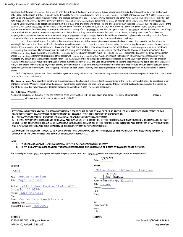 to both the Seller and the Buyer: a. A duty of utmost care, integrity, honesty and loyalty in the dealings with agent has the following either Seller or the Buyer. b. Other to the Seller and the Buyer as stated above in their r (a) or (b) of this paragraph 24.2. (2) In both Seller and Buyer, the agent may not, without the express permission of the not limited to, facts to either Buyer's or Seller's Party, disclose to the other Party bargaining or other personal including, but that may impact price, including Seller's willingness to accept a price less than the price or Buyer's willingness to pay a price greater than the price (3) The above of the agent in a real estate do not relieve a Seller or Buyer from the responsibility to protect their own interests. Buyer and Seller should carefully read all agreements to assure that they adequately express their understanding of the A real estate agent is a person to advise about real estate. If legal or tax advice is desired, consult a competent professional. Buyer has the duty to exercise reasonable care to protect Buyer, including as to those facts about the Property which are known to Buyer or within Buyer's diligent and competent professional because the federal and state tax consequences of a Both Seller and Buyer should strongly consider obtaining tax advice from a can be complex and subject to change. Further Disclosures . Throughout this Buyer and Seller may receive more than one disclosure, depending upon the number of agents (d) in the agent in this Buyer and Seller should each read its contents each it is presented, considering the and that disclosure. Buyer and Seller each acknowledge receipt of a disclosure of the possibility of between them and the real estate by the Broker that principal. This disclosure may be part of a agreement, buyer Buyer may also represent other buyers, who may consider, make on agreement or separate document. Buyer understands that on or acquire the Property. Seller understands that Broker Broker Seller may also represent other sellers with respect to any default or breach hereof by either Party. The that may be of interest to this Buyer. Brokers have no responsibility with agree that no lawsuit or other legal proceeding involving any breach of duty, error or omission to this may be brought against Broker more than one year the Date of Agreement and that the liability (including court costs and fees), of any Broker with respect to any breach of duty, error or omission to this Agreement shall not exceed the fee received by such Broker pursuant to this Agreement; provided, however, that the foregoing on each Broker's liability shall not be applicable to any gross negligence or willful misconduct of such Broker. 24.3 Buyer and Seller agree to to Brokers as any or given Brokers that is considered by such Party to be 25. of Agreement. In construing this Agreement, all headings and are for the convenience of the only and shall not be considered a part of this Agreement. Whenever required by the context, the singular shall include the plural and vice versa. This Agreement shall not be construed as if prepared by one of the but rather according to its fair meaning as a whole, as if both had prepared it. 26. Provisions. provisions of this hereto by an addendum or addenda of paragraphs through . (If there are no if any, are as follows or are provisions write "NONE".) ATTENTION : NO REPRESENTATION OR RECOMMENDATION IS MADE BY AIR CRE OR BY ANY BROKER AS TO THE LEGAL SUFFICIENCY, LEGAL EFFECT, OR TAX CONSEQUENCES OF THIS AGREEMENT OR THE TRANSACTION TO WHICH IT RELATES . THE PARTIES ARE URGED TO : 1. SEEK ADVICE OF COUNSEL AS TO THE LEGAL AND TAX CONSEQUENCES OF THIS AGREEMENT . 2. RETAIN APPROPRIATE CONSULTANTS TO REVIEW AND INVESTIGATE THE CONDITION OF THE PROPERTY . SAID INVESTIGATION SHOULD INCLUDE BUT NOT BE LIMITED TO : THE POSSIBLE PRESENCE OF HAZARDOUS SUBSTANCES, THE ZONING OF THE PROPERTY, THE INTEGRITY AND CONDITION OF ANY STRUCTURES AND OPERATING SYSTEMS, AND THE SUITABILITY OF THE PROPERTY FOR BUYER'S INTENDED USE . WARNING : IF THE PROPERTY IS LOCATED IN A STATE OTHER THAN CALIFORNIA, CERTAIN PROVISIONS OF THIS AGREEMENT MAY NEED TO BE REVISED TO COMPLY WITH THE LAWS OF THE STATE IN WHICH THE PROPERTY IS LOCATED . NOTE: 1. THIS FORM IS NOT FOR USE IN CONNECTION WITH THE SALE OF RESIDENTIAL PROPERTY. 2. IF EITHER PARTY IS A CORPORATION, IT IS RECOMMENDED THAT THIS AGREEMENT BE SIGNED BY TWO CORPORATE OFFICERS. The undersigned Buyer and agrees to buy the Property on the terms and stated and acknowledges receipt of a copy hereof. Date: BROKER CBRE Jordan Hershiser Title: Buyer's broker Address: 4141 Inland Empire Blvd., #100, Ontario, CA 91764 Phone: (214)649 - 1568 Fax: Email: Jordan.Hershiser@cbre.com Federal ID No.: Broker DRE License #: 00409987 BUYER Silver Music LLC and/or Assignee By: Name Printed: Rajat Khurana Title: Buyer Phone: Fax: Email: By: Name Printed: INITIALS © 2019 AIR CRE. All Rights Reserved. OFA - 20.30, Revised 10 - 13 - 2022 INITIALS Last Edited: 5/7/2024 1:39 PM Page 9 of 10