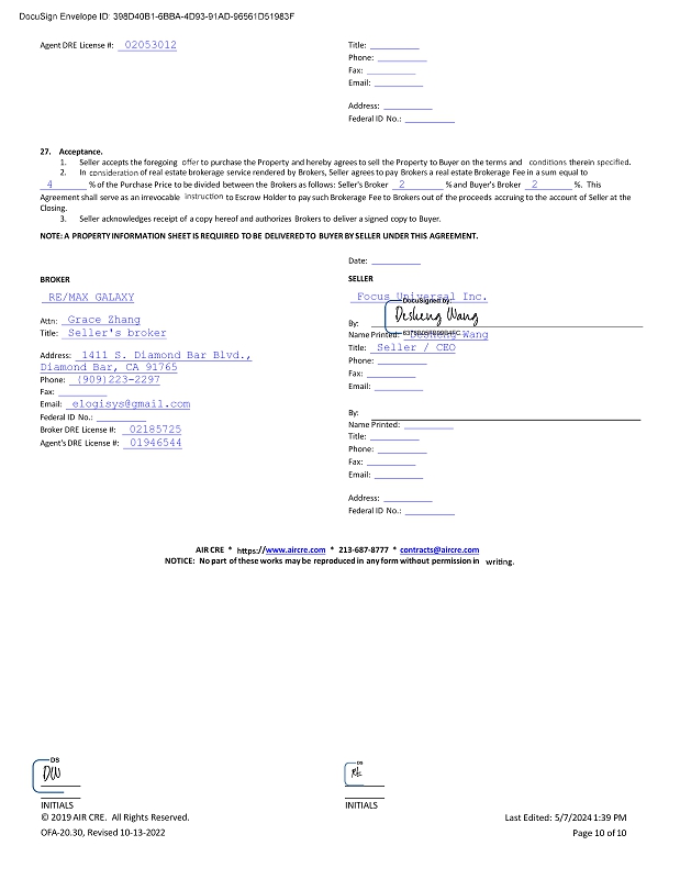 Agent DRE License #: 02053012 Title: Phone: Fax: Email: Address: Federal ID No.: 27. Acceptance. 1. Seller accepts the foregoing to purchase the Property and hereby agrees to sell the Property to Buyer on the terms and therein 2. In of real estate brokerage service rendered by Brokers, Seller agrees to pay Brokers a real estate Brokerage Fee in a sum equal to 4 % of the Purchase Price to be divided between the Brokers as follows: Seller's Broker 2 % and Buyer's Broker 2 %. This Agreement shall serve as an irrevocable to Escrow Holder to pay such Brokerage Fee to Brokers out of the proceeds accruing to the account of Seller at the Closing. 3. Seller acknowledges receipt of a copy hereof and authorizes Brokers to deliver a signed copy to Buyer. NOTE: A PROPERTY INFORMATION SHEET IS REQUIRED TO BE DELIVERED TO BUYER BY SELLER UNDER THIS AGREEMENT. Date: BROKER RE/MAX GALAXY Grace Zhang Title: Seller's broker Address: 1411 S. Diamond Bar Blvd., Diamond Bar, CA 91765 Phone: (909)223 - 2297 Fax: Email: elogisys@gmail.com Federal ID No.: Broker DRE License #: 02185725 Agent's DRE License #: 01946544 SELLER Focus Universal Inc. By: Name Printed: Desheng Wang Title: Seller / CEO Phone: Fax: Email: By: Name Printed: Title: Phone: Fax: Email: Address: Federal ID No.: AIR CRE * // www.aircre.com * 213 - 687 - 8777 * contracts@aircre.com NOTICE: No part of these works may be reproduced in any form without permission in INITIALS © 2019 AIR CRE. All Rights Reserved. OFA - 20.30, Revised 10 - 13 - 2022 INITIALS Last Edited: 5/7/2024 1:39 PM Page 10 of 10