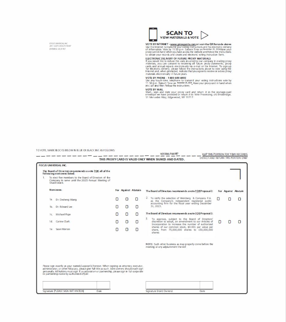 FOCUS UMVCRSAL INC Ell EASTLOCVSTCWRT Of,ffA ೦ O, CA 91761 Ƒ SCAN TO VIEW MATERIALS &VOTE [> VOTE BY INTERNET - www.proxyvote.com or scan the QR Barcode above Use the Internet to transmit your voting instructions and to, electronic del very TO VOTE, MARK BLOCKS BELOW IN BLUE OR BLACK INK AS FOLLOWS· ೦೦ P ೦ B2,_ KEEP THIS PORTIONFORYOURRECORDS THIS PROXY CARD IS VALID ONLY WHEN SIGNED AND DATED, DETACH ANDRETURN THIS PORTON ONLY FOCUS UNIVERSAL INC 2024 Nominees: For Against Abstain D D D Or Desheng Wang 1a D D D Dr. Edward lee 1b. D D D Michael Pope 1c D D D Carine Clark 1d. D D D Sean Warren 1e. Please sign exactly as your name(s) appear(s) hereon . When signing as attorney, executor, administrator, or other fiduciary, please give full title as such . Joint owners should each sign personally . All holders must sign . If a corporation or partnership, please sign in full corporate or partnership name by authorized off cer . I S I ignature [ P LEASE SIGN WITHIN BOX) I Date 7 The Board ofDirectors recommends a vote FOR Proposal 2: For Against Abstain D D D ε d: ε t εεεε : εεε r εε ೦೦೦ Ii ೦ e C:: ε o ε n εε n ε f1; εεε r;; fiscal year ending December 31, 2023. The Board of Directors recommends avote EQB_ Proposal 3: To approven amendment to our Art cles of lncorpcration D D D NOTE: Such other business as may properly come before the meeting or any adjournment thereof I I Signature (Join t Ovimers) I Date To ratify the selection of Weinberg & Company P . A . as the Company's independent registered public accounting firm for the fiscal year ending December 31 , 2023 . 3 . To approve, subject to the Board of Directors’ discretion to adopt, an amendment to our Articles of Incorporation to increase the number of authorized shares of our common stock, $ 0 . 001 par value per share, from 75 , 000 , 000 shares to 150 , 000 , 000 shares proxy card in hand when you have access the website and follow the instructions to obtain your records and create and electronic voting instruction form . ELECTRONIC DELIVERY OF FUTURE PROXY MATERIALS If you would like to reduce the costs incurred by our company in mailing proxy materials, you can consent to receiving all future proxy statements, proxy cards and annual reports electronically via e - mail or the Internet . To sign up for electronic delivery, please follow the instructions above to vote using the Internet and, when prompted, indicate that you agree to receive or access proxy materials electronically in future years . VOTE BY PHONE • 1 - 800 - 690 ೦ 903 Use any touch tone telephone to transmit your voting irstructions vote by r November 29, 2024 • ave your proxy card in hand when ; εε s ; a fl'a ε d Eth! ε foTi ε t h ε ins t ructions . H VOTE BY MAIL Mark, sign and date your proxy card and return it in the postage - paid envelope we have provided or return it to Vote Processing, do Broadridge, 51 Mercedes Way, Edgewood, NY 11717 of information. Vote by 11 :59 p.m. Eastern Time on November 29, 202 . 4 Have your The Board of Directors recommends a vote .EQ.Rall of the following nominees listed: 1 To elect five members to the Board of Directors of the Company to serve until the 2025 Annual Meeting of Shareholders