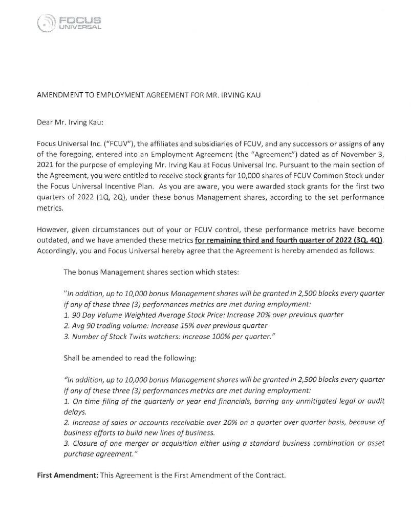 (. - FOCUS \ :._;;' UNIVEA5AL AMENDMENT TO EMPLOYMENT AGREEMENT FOR MR . IRVING KAU Dear Mr . Irving Kau : Focus Universal Inc . ("FCUV"), the affiliates and subsidiaries of FCUV, and any successors or assigns of any of the foregoing, entered into an Employment Agreement (the "Agreement") dated as of November 3 , 2021 for the purpose of emp l oying Mr . Irving Kau at Focus Universal Inc . Pursuant to the main section of the Agreement, yo u were entitled to receive stock grants for 10 , 000 shares of FCUV Common Stock under the Focus Universal Incentive Plan . As you are aware, you were awarded stock grants for the first two quarters of 2022 (lQ, 2 Q), under these bonus Management shares, according to the set performance metrics . However, given circumstances out of your or FCUV control, these performance metrics have become outdated, and we have amended these metrics for remaining third and fourth quarter of 2022 ( 3 Q, 4 Q) . Accordingly, you and Focus Universal hereby agree that the Agreement is hereby amended as follows : The bonus Management shares section which states: "In addition, up to 10,000 bonus Management shares will be granted in 2,500 blocks every quarter if any of these three (3) performances metrics are met during employment: 1. 90 Day Volume Weighted Average Stock Price: Increase 20% over previous quarter 2. Avg 90 trading volume: Increase 15% over previous quarter 3. Number of Stock Twits watchers: Increase 100% per quarter." Shall be amended to read the fo l lowing: "In addition, up to 10,000 bonus Management shares will be granted in 2,500 blocks every quarter if any of these three (3) performances metrics are met during employment: 1. On time filing of the quarterly or year end financials, barring any unmitigated legal or audit delays. 2. Increase of sales or accounts receivable over 20% on a quarter over quarter basis, because of business efforts to build new lines of business. 3. Closure of one merger or acquisition either using a standard business combination or asset purchase agreement." Fi rs t Amendment : This Agreement is the First Amendment of the Contract .