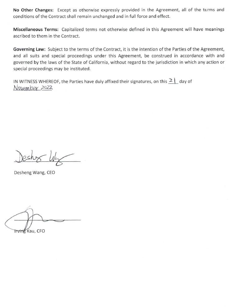 No Ot h e r Chang e s : Except as otherw i se expressly provided in the Agreement, all of the terms and condit i ons of the Contract s hall remain unchanged a nd in full force and effect . Mi s cellaneou s Terms : Capitalized terms not otherwise defined in this Agreement will h ave meanings ascribed to them in the Contract . Governin g Law : Subject to the terms of the Contract, it is the i n tention of the Pa r ties of the Agreement, and all suits and special proceedings under this Agreement, be construed in accordance with and governed by the laws o f the State of California , without regard to the ju r isdiction in which any action or special proceedings may b e instituted . IN WIT N ESS W H EREOF, the Parties have duly affixed their signatures, on this day of N o v e m \ ?ey ? 0 2 2 . Desh e ng Wang, CEO