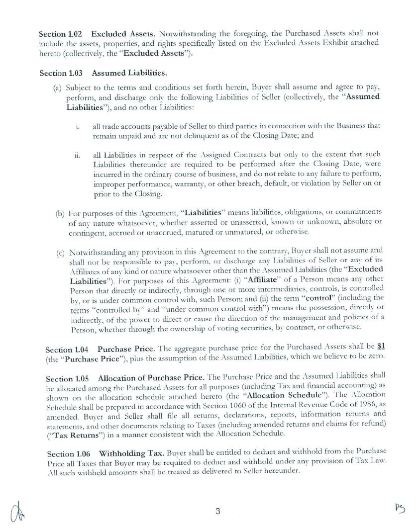 S ec ti o n 1 . 0 2 Ex clud e d A s s e t s . l' \ orw ith sta ndin g the foregoi ng, the Purcha se d . \ sse t s s hall not include the asse t s, properties, and right s s pecificall y li s ted on the Excl uded , \ ss ets Exhibit atta c hed herem ( collecrfrcly, the " Ex clud e d Asse t s ") . Sec ti o n 1 . 0 3 Ass um e d Li a b i liti es . (a) S ubje ct to the terms and co nditi ons se t forth he rein, Bu ye r s hall assume and agree to p ay, p e r form, and di sc h arge only the following T . i a biliries of Se ller ( col k c civcl y, the " Ass um e d Li a biliti es "), a nd n o o ther I . iabilitic s : · J . all rr ade accounts payable o f Sdle r to third parti es in connection with the Bu si n cs!" that r e main unpaid and arc not delinqu e nt a s o f the Closi n g Date ; and u . a ll J . iabilities in r es pe cr of th e . \ ssig ned Contrac t s but on ly to the ex t e nt that s uch Liabilitie s th ere under arc required to be performed after the C l os in g Dare, we r e in c urr ed in the ord i n ary course of bu s in ess, an d d o n o t relate to any failure co perform, improper performance , warranty , o r ot h er breach, d efau lt , or vi o lation b y Se ll e r o n o r pri o r to the Cl os in g . Q ) ) F or p urposes of this . \ gree ment , " Li ab iliti es" mean s liabilitie s, ob li ga t io n s, or commionents of any natur e whatsoen : r , whet h er a sse rt e <l o r u na ssc rt e d, kn own o r unknown, ab solurc o r conti n ge nt , acc ru e d o r unaccrued, matured or unmarure<l , or o th e rwi se . ( c ) ocwirhsran<ling a n y pro, · i sion i n thi s . \ g r ec ment ro the conmu)·, 13 u ycr s h a ll n ot assume anJ sha ll n or bc respo 11 siblt .: t o p a y, perform , or di chargc any T . iabiliric : - o f Seller nr any o f in : . \ ffi J iatcs of an y kind or narurc w h atsoeYer ot h er th a n the . \ ss um e d,i J abilitie s ( the· " Excl ud e d Li a biliti es ") . F o r purpo ses of thi s . \ g r ee m e n t : ( i ) " Affi li a t e " of a P erson 1 n cans a ny other P e rson t h at directl y o r indi . rec d y, throu g h o n e o r m o re intermedi aries, co nr rols, i s conrrollcd b y, or is under com m o n contro l with, s u c h P e r son ; and ( ii ) the term " co ntr o l " ( including t h e term s " controlled b, · " an<l " und e r co mm o n conr . r o l wit h ") m ea n s the po ssess i o n , din : ctly or indirectly, of tl - w p o . wer to direct o r cause th e direction of the management and policies of a P erson, whether through rhc ow ner s hip of , · oring secu ri ties, h y con tr ac r , or othen , ; i : - e . S e c t ion 1 . 04 Pur chase Pr ice . The agg r ega te purchase p 1 ice for chc Purchased . \ ssets sha ll be . i 1 ( th e " P u rc h ase Pri ce "), p l u s t he a ss umption of the . \ ss umcd ] . i abilities, whi c h we belien· to be zero . Sec ti o n 1 . 0 5 All oca ti o n o f Pur c h ase P r i ce . Th e Pur c ha se Pric e and t h e . \ s : rn mcd I . iabi liti cs shall be allocan : d a m o n g the Pur c h ased . \ s ::: er s for al l pu 1 voses ( includin g Tax a nd financia l accou nrin g ) a :: s l w \ \ · n o n t he a ll oca cion sc h e dule attac h e d h erero ( the " All oca ti o n Sc h e dul e " ) . T h e . \ ll ocation S chedule s h a ll be prepared in accordance with Sec ti on 1060 of the lnr e rnal R e \ 'enue Co de of 1986 , as amrndcd . Bu yer and S eller s h a ll file all returns, <l e cl ararions, r eports, infom 1 ation ffturns and statcmc· nr s . : rnd o th e r documents rel ating ro Taxes ( inclu<ling amended re tu rns an d cl a im s fo r refund ) (" Tax R et u r n s " ) in a mruu 1 er co n s i s renr with th e . \ !l oc ati o n Sc heduJ e . Sec t io n 1 . 0 6 W ithh o ldin g Tax . Bu yer s h a ll be entitled to d educt and \ \ ; th h o ld from r h e Purchase Price a ll Ta xes th a t Bu ye r ma y be re t 1 uired to deduct and \ \ ithhold under any prm · i s i o n o f Tax J . aw . . \ ll : - u c h \ \ ·irhhcld amounts s h a ll bt .: trcare d a s <lcliYer e <l to Sc : ller hereun<ler . 3
