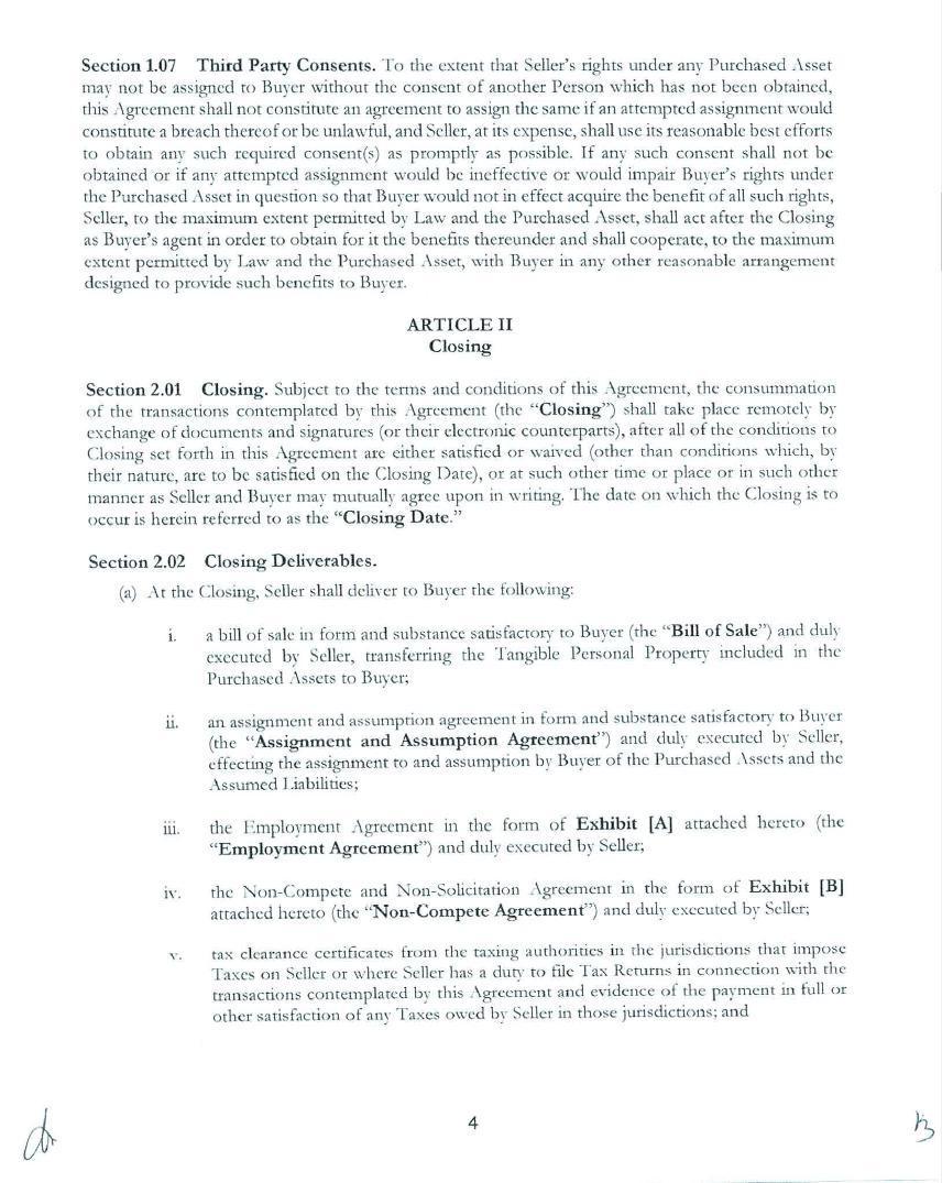 Section 1 . 07 Third Party Consents . To the extent that Selle r 's rights under any Purchased . \ sset may not be assigned to Buyer without the consent of another Person which has not been obtained, this , \ grcemenc sha ll not constitute an agreement to assig n t he same if an attempted assignment would constinite a breach th ereof or be unla \ \ 'ful, and Seller, at its expe n se, sha ll use it s reasonable best efforts to obtain any such rcc 1 u irccl conscnt(s) as prompt l y as pos ihle . If any such cc m sent shall not be obtained or if any attemp ted assignment would be ineffectiYe or would impair Buyer's rights u nd e r rhc Purchased . \ sset in qu es ti on so that Buyer would not in effect acquire the benefit of a ll such rights, Selle r, t"o the maximum extent permitted by Law and the Purchased, \ ssct, sha ll act after the Closing as Buyer's agent in order to obtain for it the benefits thereunder a nd sha ll coopera t e, to the maxi . mum extent pcmuttcd by Law and the Purchased , \ sset, \ Vi . t h Buyer in any o ther reasonable arra n ge m ent designed to proYide such benefits t o Buyer . ARTICLE II Closing Section 2 . 01 Closing . Subject to the terms and conditions of this . \ greemcnt, the consummation of the n : ansacrions contemp l ated b y this . \ g re ement (the " Closing ") shall rake place rcm . orcly by exc han ge of documents and signatures (or their electronic counterpa r ts), after a ll of the conclirions to Closing set forth in this . \ grecmcnt arc either satisfied o r waiYed (other than conditions which , by t h eir nature, are to be sacisfic<l on the Closing Date), or a t such other tin 1 c or place or in such other manner as Seller and Buyer may mutually agree upon in writing . Th e date on \ \ ·hich the Closing is to occur is her ein referred to as the "Clos ing D a t e . " Section 2 . 0 2 Closing Deli vera bl es . (a) . \ r the Closi n g, Se ll e r shall deliYer t0 Buyer the following: 4 1. a bill of sale in form and substance satisfactory to Buyer (t h e " Bill o f Sale ") and duly executed by Se ll er, transforring the Tangible Personal Property included in the P urchased , \ ssecs co Huyer; u . an assignment and assumption agreement in form and substance satisfactory to Buyer (the " Ass i gnment and Assumption Ag re e m e nt ") and duly executed b · Seller, effecting the assignment to an<l assumption b \ " Buyer of the Pur chased . \ ssets and the Assumed J . i abilitics ; lll. the Emp lo yment . \ greement in the form of Exhibit [A] attached hereto (the "E mplo yme nt Agree ment ") and duly executed hr Se ller ; 1 \ ·. the No n - Compete a nd Non - Solicitatjon . \ greemeut in t h e form of Exhibit [BJ attac h ed hereto (the " Non - Compete Agree m e nt ") an<l duly executed by Seller; "· rax clearance cc 1 : tificarcs from the taxing aut h o ritie s i n the juri : d . iccions char impose Taxes on Seller or where Se ll e r h as a dut \ " to file Tax Returns in connection \ vith r h c transactions conremplared by this , \ gree 1 cnt a nd e \ ·idence of the payment in full or other satisfaction of any Taxes owed by Seller in those jurisdictions : and