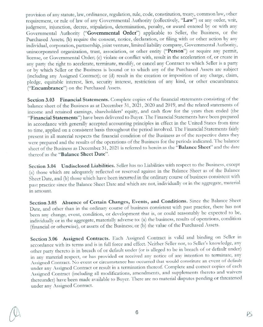 pro, -- ision of any s ta t ute, l aw, ordinance, regulati o n, rule, c o de , constitution , treary, common l aw, o ther requirement , or rule of l aw of any Go,·ernmental . \ uchorit y ( coHecti, · ely , " L aw ") or an · o rder , writ, judgment, injunction , de c re e, stipulation, determination , penalty, or award entered by o r w - ith an y Gon rn mental . \ uthori t y (" Governmenta l Order ") applicable to Seller, the Busines s, or th e Pur c hased . \ ssets ; (b) require the consent, noti c e, declaration, or filin g with or other action by any i . ndiYidual, cor p o rati o n, partners h ip , j o int Y c ntu r e, limired liability company, GoYernmcntal : \ uthorit y, uni n corporated organization, u 1 . 1 st , association, or other entity (" Per s on ") or ret 1 uire any permit, li cense, or G o Yernmenta l Order ; ( c ) Yiolate or conflict with , re s u l t in the acceleration o f , or c r eate in any party the right to accelerate , tenninate, m o dify , or cancel a n y Contract to whjch Se ller i s a party or by which Seller or the Bu s ines s i s bo u nd o r to whi c h any of the Purcha s ed . \ ss et s arc su bj ect ( including an y Assigned Co nrract ) ; o r ( <l ) re su lt in the creation or impos i t ion of an y c harge , claim, pledge, e qui ta ble intere st , lien , sec urity i ntere sr, re str iction of an y ki . n<l , or other encumbrance (" En c umbrance ") o n th e l'urcha se d . \ ssers . Section 3 . 03 Financial St a tement s . Co m pkte co pie s o f t h e financial statements co n s istin g of rhc ba l ance sheet of the Busine ss a s at Decemb e r 3 1 , 2021 , 2 020 and 20 1 9 , and the related sta t e ments of income an<l retained earnings, s hareh o lder s' ec 1 uity, and cash flow for rh e ye a r s rhcn ended (the " F i nan c i a l Stat e ments ") haYe b een dcfo ·e red to Buyer . T h e Finan c ial Stateme nt s h an : be e n prepared in ac c o rdance with generally accepted accounting principle s in effect in the l i nite<l S tate s from tim e to time, applied on a consistent ba s is through o ut the period im·oh - ed . The Financial State ment s fairl y p r esent in a ll material re s pe c t s th e financial condition of the Bu s in ess as o f the rc spec ciYc dates they were prepared and th e results of the o perati o ns o f the Bu s ine ss for t he p c ri o <l s indi cated . The balance shee t of th e Busine ss as D ecem ber 31 , 202 1 i s referred to h ere in as t h e " B a l a n ce Sh ee t " an<l the d are thereof a s the " Balan c e Sh ee t Dat e" . Sect i o n 3 . 04 Undi s cl o s e d Liabiliti es . Se ller h as no Liabi . liti es w i th r es pe c t to th e Bu si ne ss , c : - ; cc pt ( a) those w h i c h arc adequately refl ec t e d o r re se n · c d against . in the B a lan c e Sh eer as of the Ba lanc e S h ee r Dat e, an d (b) tho se which ha, ·e been incurred in th e or<li nar r course of busincs :; consistent with pa s t practi ce s ince the Ba l ance S h e et Date and \ \ ·hicl 1 arc not, indi, · iduall y o r in the aggrega t e , material in amou n t . S ec ti o n 3 . 0 5 Abs e nc e o f C e rt a in C han ges , Events, a nd Conditi o n s . Si nc e the Balance : S h ee t Date , an d orher than in the ordi nar y course of business consistent with pa st practic e, there has not been an y c han ge, e,·ent, condition, o r d c , ·clopmc nt that i s, or cou l d reasona bly b e ex p ecte d to be, indiY i dually or in the aggre g ate, mat e ri a lly ad,·erse to : (a) the bu s ine ss . results of operatio ns, co n c lition ( fi n a n cia l or othcnvi se), or assets of the Bu s ine ss ; or )) the nluc of rhe Purch ased . \ ssets . Sec ti o n 3 . 06 A ss ign e d Co ntra c t s . Each . \ ss i g n ed Conu : act i s , ·a lid and bindin g o n Se ll er in accorda nce with it s term s and i s in full force a nd effecte . it h e r S ell er n or, to Se ll er's knowkJge, any other parry the r eto i s in breach of or d efou l t u nd er ( o r i s alleged t o be in breach of o r default u nJcr ) in any materia l re s p ec t , or ha s pr o, ·idc<l or rc cei , - cd any n o ti ce of any intention to termina te, an y Ass igned Cona : act . No e ,·cnt u r cin : umsrancc lia :; (Jt : cu . rn : d Lhar would consrirurc a n cn : nt of <lcfaulr un<lcr an , y \ ss igncd Co ntra ct or result in a termination thereof . Co mplete an<l correct co pi es of each , \ ssig n ed Co ntr act ( includin g aU modificati o n s, amendment s , a nd supplements thereto and ,, · ai,·ers th e r e u nder ) h a , ·e b ee n made arnilable to Buyer. Th e re arc n o mat e i:ial di s putc.:s pending or t hreat e n ed under any r \ ss igncd Co ntract. 6