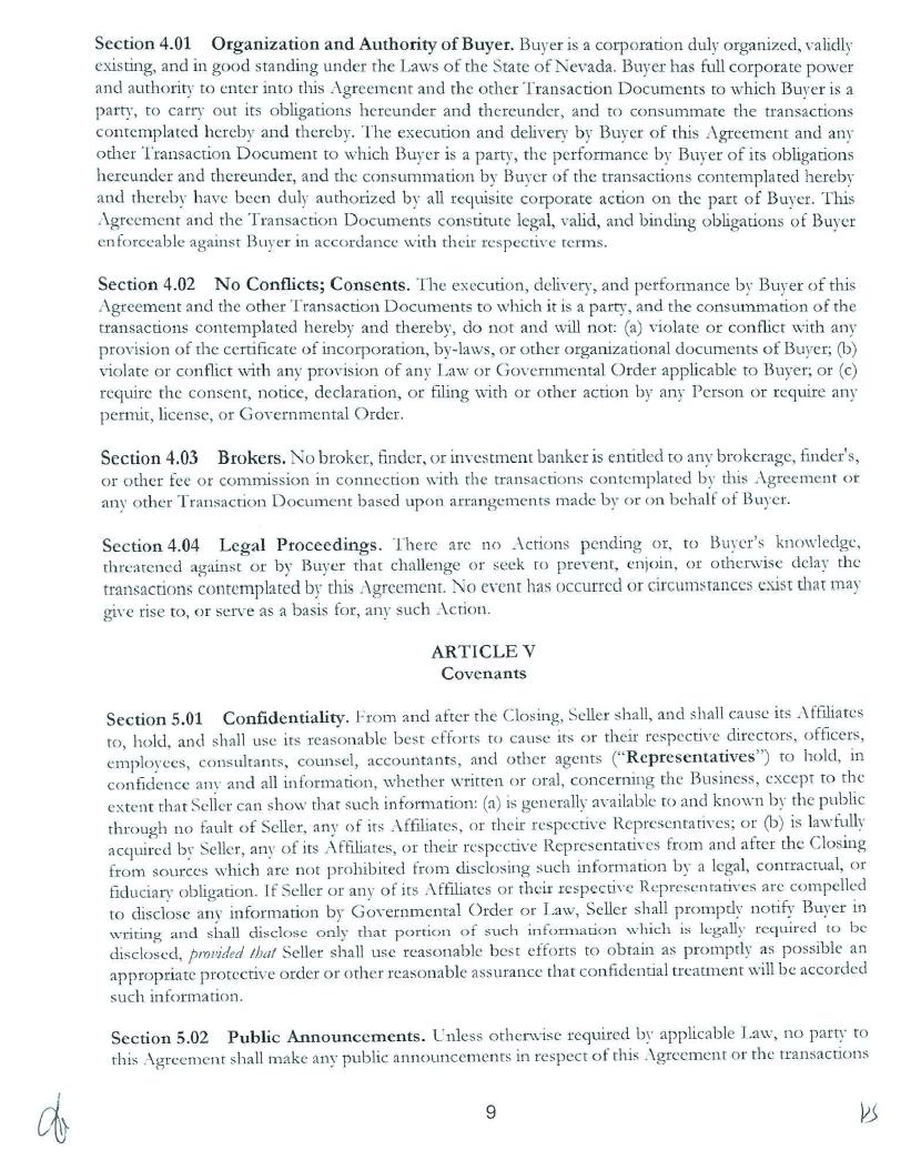 Section 4 . 01 Organizati o n and Authority of Bu ye r . Buyer is a corporation duly organized, Yalidly existi n g, and in good standing under the Laws of che Stare of Nenda . Buyer has full cor p orate power and aut hori ty to enter into this Agreement and the other Tran sa ction Documents to which Burer is a patty, to carry out it s obligations hereunder and thereunc . ler , a nd to con sum mate the tran s ; ctions conte mpla ted h ere b y and thereby . Th e execution and deliver y by Buyer of rhis , \ gre ement and any other Tran saction Docum e nt t o which Buyer i s a party, the performance by B u yer of irs obliga ti ons hereunder and thereunder, and chc consummation by Huyet of the transaction s conte mplated hereby a n<l thereby ha ve been dul y authot zed by all retiuisire corporate action on the part of Buyer . This , \ greemenr and th e Tran saction D oc uments co n stitute legal Ya lid and binding obligations of Buver c forccable agai n s t Buyer in accordance \ ,·ith th cir rcspccti, - term . ' ' Section 4 . 02 No Conflict s ; Consents . The execution, d diwry, and per formance by Buyer of thi s Agreement and the ot h e r Transaction Documents ro w h ich it i s a party, and the consummation o f the transactio n : , ; co nt emp lated hereby and thereby , do not and will not : (a) , · i o l ate o r con fli ct wich a n y prO \ ·is i on of the certificate of i . nco 171 oration, by - laws , or other organizational Jocumenrs of Bu yer ; 0 ) ) violate or conflict with any prO \ · i sio n of any J ,aw or Governme n t al Order applicable to Hu ycr ; or (c) require th e consent, notice, declaration , or filing wit h or other action by any P erson or require any permit , licen se, or GoYernmental Order . Section 4 . 03 Brokers . No broker, finder, or inn .: stmenc banker is entitled co a n y b r okerage, finder ' s, or other fee or comm i ssion in co n nection with rhe transactions contemplated by chi s • \ grecmenr ot a ny ot her Transaction Document based upon arrangements made by or on behalf of B u ye r . Sectio n 4 . 04 Le ga l Pro cee dings . There arc no . - \ ctions pending or, co 13 uycr 's kn owle dge, tbn·arened against or by Buyer that cha ll enge or see k to pre,·enc, enjoin . or otl 1 < .: rwise delay the transactions contemplated by thi s, \ g reemcnt . >io cn : nt ha s occurred or circumstances exi st that may gi,·c rise to, or sCT - ve as a bas i s for, any s uch • \ ction . ARTICLE V Covenants Section 5 . 01 Confidentiality . From and afrer rhe C lo s ing, Seller shall, and shall ca us< . i : t s - \ ffi . liates to , ho ld , and s l rnll u s e i ts reasonable be s t efforts to came ics o r their respcctin : directors, officers, employe( : S, co n su ltants, counsel, accountants, an<l o tl 1 er age n ts (" R ep r ese ntati ves ") ro hold, in confidence anv and all i nformation, ,vhcthcr written or ora l , conce rni ng tl 1 c Busines s, excep t to t he extentt h at Sc licr ca n show char s uch information : (a) i s generally a ... - ailabk ro and known by the public through n o fault of Seller, any of it s . \ ffiliatcs, or th eir respecti, · e R ep r cscntatiYcs ; or (b) is l awfully actJuirecl b · Se ller , any of it - s \ ffiliatcs, or their rcspccti, ·e Represenrnti, - c s from and after the Closing from sou r ces which ar c n ot prohibited from disclosing such information b y a legal, conrracrua l , or fiduciary obligation . I f Sel l er or any of it s . - \ ffiliarc s o r their respecti,·c Rcpre senraciYcs arc compe ll ed to clisclo s c any information by Go,·ernmental Order or J . aw, Seller s hall promptly notify Buyer i n w r iting and s hall disclo se only ,hat pon . ion of such information which is legally rcc 1 uir cd t o be disclosed, p 1 YJ/ 1 ided Iha! Se ll er s hall use reasonable best efforts to obtain as promptly as possible an appro pri ate protccti ... - e order o r oc h e r r easonable assw : a nce that co nfidential treatm ent \ Viii be accorded such in fo rm ation . Sec ti o n 5 . 02 Publi c Announcements . l . nle ss ot hen, · ise required by applicable T . a \ v, no parry to th i s . - \ gree m e nr s h a ll make any public announcements in respect of this . \ grce menr or the transactions 9