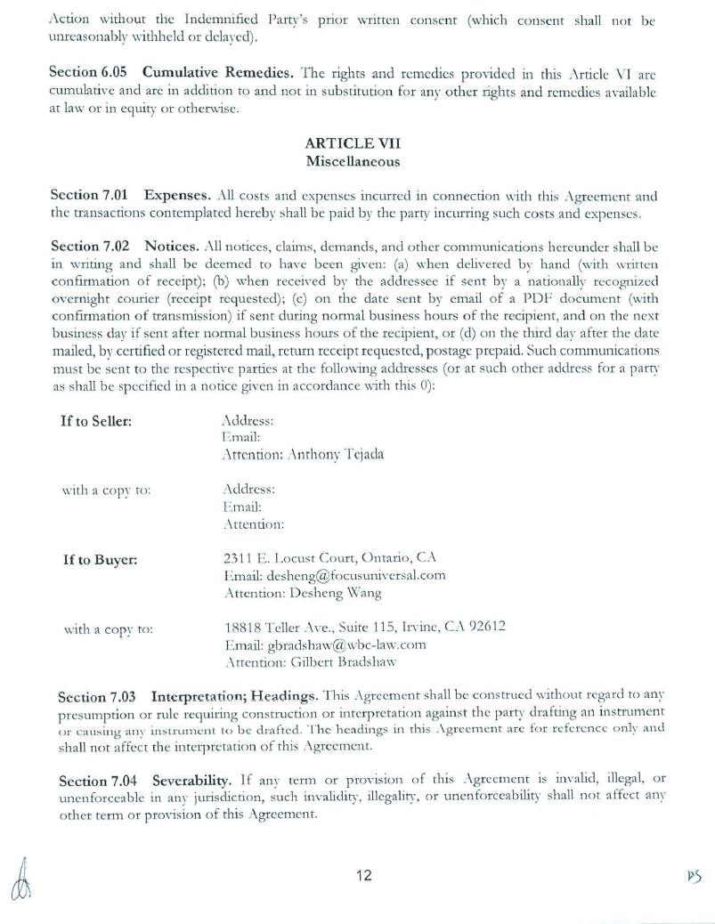 - \ ccion without tJ 1 e 1 n<lemnified P arty's pri or written consent ( which ccmsent s hall not be unr easo nab l y , \ · ithhcld or delayed ) . Section 6 . 05 Cumulative Rem ed ie s . The rights and remedies prm·idcd in this 1 \ rticle \ 'J arc cumulatiYc and arc in addition to and not in substitution fo r any other rights and remedies an . ilablc at la,v or in equity o r othetwise . ARTICLE VII Mi sce llaneou s Section 7 . 01 Expenses . , . - \ ll costs an<l expenses incw : re< l in connection with thi s . \ grecmcnt and the transactions contemplated hereby s hall be paid by tJ 1 c p arty i n curring such costs and expenses . Section 7 . 02 Notices . All notice s , claims, demands, and ot h er communications hcrcundcr s hall be in writing and s hall be deemed to have been giYen : (a) when deliYete<l by hand ( with written confirmation of receipt ) ; (b) when receiYcd by the addressee if se nt by a nationall y recognizcd o,·ernight courier ( receipt rcqucstcd) ; (c) on th e date sent by email of a PDF document (, , · ith confirmat i o n of trans mis sio n ) if sent during normal business hours of the recipient , and on the ne : xr business day i f se n t after normal business hours of the recipient, or ( d ) on the third da · after the date mailed, by certified or registered mail , return receipt requested, postage prepa i d . Such commu ni cations mu st be sent to the re s pecti, - c parties at the following addresses (o r at such other address for a parry as shall be specified in a n oti ce gi \ ·en in accordance ,v - - ith this 0 ) : 12 If to Seller: , \ ddrcss: Fmail : . \ ttcntio n: . \ nrhony Tejada \ Vith a copy to: Ifto Buy er: with a copy to: : \ ddrcs s : E mail: . \ teen tion: 2311 E. L ocus r Court, Ontario, C \ Email: desheng@focusuniversal.com A.trention: D es h cng \ Vang 18818 Teller . \ vc. , Sui te 115, ln ·i ne, C. \ 92612 Email: gbradshaw@wbc - law.com . \ ttention: Gilben Bradshaw Section 7 . 03 Int e rpr e t a tion ; Headings . Thi s . \ grccmcnt sha ll be com trued without regard to any pre s umption or rule re c 1 u irin g construction or interpretation against the party drafting an instrument o r causing any i . nstrutnc n t to be draft ed . The h eadi n g!" i . n thi s . \ g rccmcnt arc for reference o nl y and shall nor affe ct the int cr pn : tatio n of this : \ greement . Section 7 . 04 Severability . lf any term or proYision o f thi s . \ gn : cment is i . nYalid , illegaL or unenforceable in any jurisdiction, such invalidity, illegalit y, or um : nforceabi lir y :; hall not affect any other term o r pro, - ision of this , \ grecmcnt .