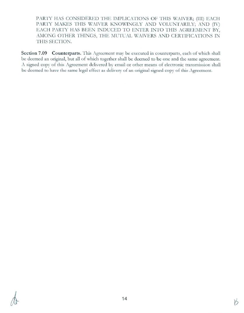 PARTY H AS C 0 1 S ID ERED TH E l IPLI C \ TIO S OF TH I S \ Xi , \ f \ 'E R ; ( III ) EACH PARTY t - . L - \ K ES T HI S W .: \ l \ TER K 1 ' - J OW I NGLY AN D VO L UN T . - \ RlLY ; r \ N D ( IV ) E . AC H P . \ RTY H AS R EE . 1 :: - - JDCCE D TO E t " TE R Ir TO THIS . \ G REE i \ Il : : N T BY , , \ I \ IO NG OTH E R THI NCS, THE J \ JL 1 T L . \ L W , - \ l V ER S . AND CERTIF I C . \ T I OK S I N THfS S J C fl Ol \ . Sec ti o n 7.09 Count e rparts. Thi s . \ greeme n t may b e executed in counterparts , eac h o hd1ich shall be d ee med a n origina l , but a lJ of which together s h a ll be deemed t o b e o n e and the s ame agre e ment. . \ s i g n ed cop y of t hi s Agreeme nt c k \ in '. n .: c.1 b y email o r oth e r mean s of cl ecu - o ni c tran s mi ssio n s h all be deemed to ha Ye the same legal effect as d e fo · ery of an origina l signed copy of this . \ grccmcnt. 14