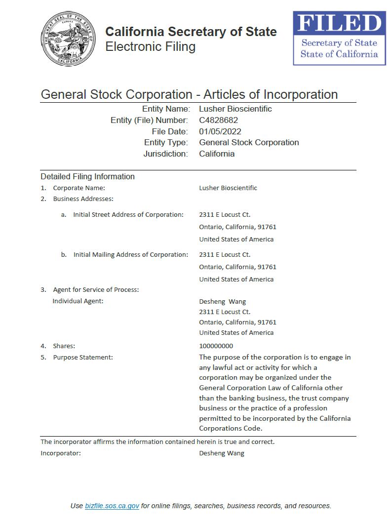 California Secretary of State Electronic Filing General Stock Corporation - Articles of Incorporation Entity Name : Entity (File) Number : File Date : Entity Type : Jurisdiction : Lusher Bioscientific C4828682 01/05/2022 General Stock Corporation California Detailed Filing Information 1. Corporate Name: 2. Business Addresses: Lusher Bioscientific a. Initial Street Address of Corporation: 2311 E Locust Ct. Ontario, California, 91761 United States of America b. Initial Mailing Address of Corporation: 2311 E Locust Ct. Ontario, California, 91761 United States of America 3. Agent for Service of Process: Individual Agent: Desheng Wang 2311 E Locust Ct. Ontario, California, 91761 United States of America 100000000 The purpose of the corporation is to engage in any lawful act or activity for which a corporation may be organized under the General Corporation Law of California other than the banking business, the trust company business or the practice of a profession permitted to be incorporated by the California Corporations Code. 4. Shares: 5. Purpose Statement: The incorporator affirms the information contained herein is true and correct. Incorporator: Desheng Wang Use bizfile.sos.ca.gov for online filings, searches, business records, and resources.