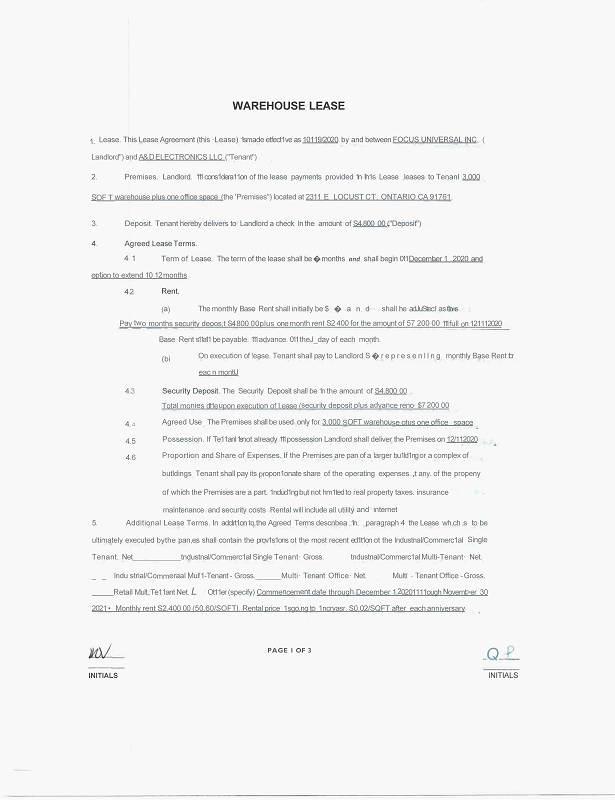 WAREHOUSE LEASE Lease. This Lease Agreement (this ·Lease) 1s made etfect1ve as 10119/2020 . by and between FOCUS UNIVERSAL INC . ( Landlord") and A&.D ELECTRONICS LLC ("Tenant") 2. Premises. Landlord. 111 cons1dera11on of the lease payments provided 1n lh1s Lease leases to Tenanl 3,000 S OF T warehouse plus one office space (the 'Premises") located at 2311 E LOCUST CT. ONTARIO CA 91761 . 3. Deposit. Tenant hereby delivers to Landlord a check In the amount of S4.800 00 ("Deposit") 4. Agreed Lease Terms. 4 1 Term of Lease. The terrn of the lease shall be ೦ months and shall begin 011 December 1 2020 and op t ion to extend 10 12 months 4 2 Rent. ( a ) The monthly Base Rent shall initially be $ ೦ and shall he adJuStec:I as follows P a y tw o months secu r ity deoos,t S4 800 00plus one mon th r ent S2 400 for the amount of 57 200 00 111 full o n 121112020 Base Rent s11a11 be payable. 111 advance. 011 theJ_day of each month. (bi 4 3 4 . 4 4.5 4.6 On execution of !ease. Tenant shall pay to Landlord S ೦ represenllng monthly Base Rent for eac n montlJ Security Deposit. The Security Deposit shall be 1n the amount of S4.800 00 Tot a l mo nie s dt1e u pon executio n of I.ease ( s ecurity deposit p l us a d ya n ce reno· $7 20 0 00 Agreed Use The Premises shall be used only for 3.000 S OFT warehou s e otus one office space Possession. If Te11anl 1s not already 111 possession Landlord shall deliver the Premises on 12/112020 Proportion and Share of Expenses. If the Premises are pan of a larger bu1ld1ng or a complex of butldings Tenant shall pay its pr opon1onate share of the operating expens e s . ,t any. of the propeny of which the Premises are a part. 1nclud1ng b u t not hm1ted to real property taxes. insurance maintenance and security costs Rental will include all utility and internet 5 . Additional Lease Terms . In adclrt 1 on to the Agreed Terms descnbea 1 n paragraph 4 the Lease wh,ch ,s to be ultimately executed bythe pan,es shall contain the prov 1 s 1 ons ot the most recent ed 1 t 1 on ot the lndustnal/Commerc 1 al Single Tenant . Net tndustnal/Com m erc 1 al Single Tenant· Gross . tndustnal/Commerc 1 al Multi - Tenant· Net . __ lndu strial/Co mm eraal Mul! 1 - Tenant - Gross . Multi· Tenant Office· Net . Multi Tenant Office - Gross . Retail Mult, . Te 11 ant Net . L Ot 11 er (specify) Comme n cem ent da t e throug h December 1 . 2 0201111 ough N ovemt>er 30 2021 • Monthly rent S 2 . 400 00 ( 50 . 60 /SOFTl . Rental price 1 sgo,ng to 1 ncryasr . S 0 . 02 /SQFT after each anniversary PAGE 1 OF 3 INITIALS Q INITIALS